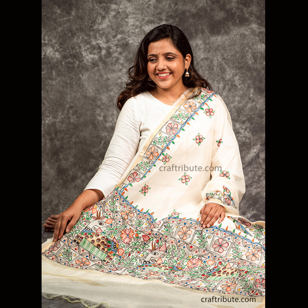 A beautiful piece of off white Cotton silk dupatta hand painted by skilled artisans from Madhubani, Bihar. Attractive floral design in vibrant colours along with deer motifs in the palla (border) that will catch hold of everyone's attention! One of its kind piece and your wardrobe essential that can be paired with a white, beige kurta for the classic look!