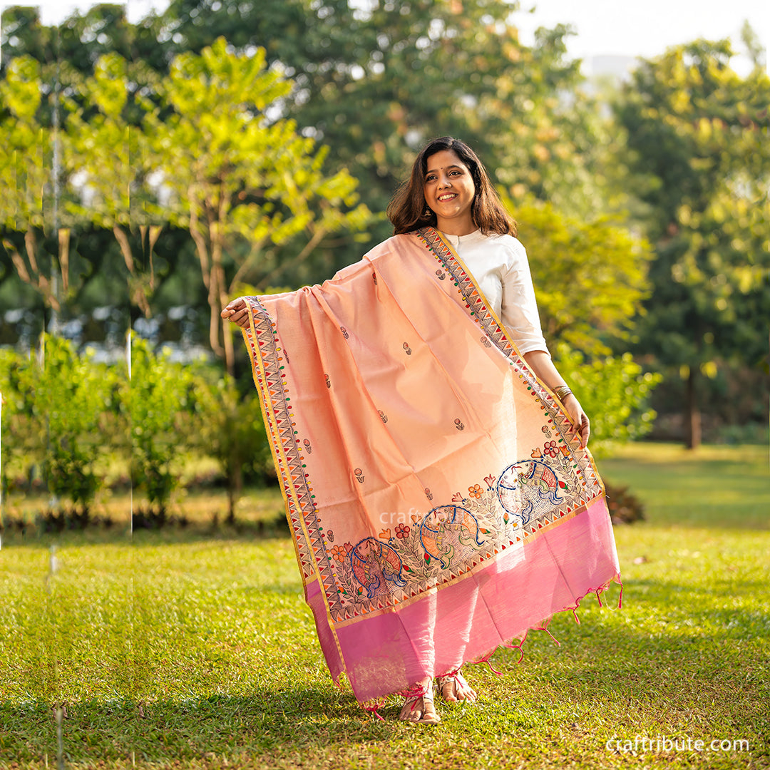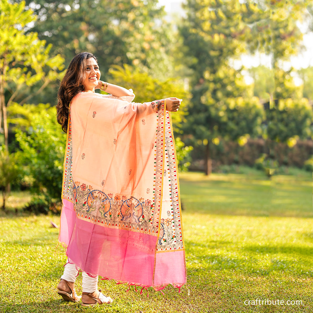A beautiful piece of Madhubani cotton silk dupatta hand painted by skilled artisans from Bihar. Delicate pink colour with intricate triangles border and elegant fish motifs makes it very attractive. Fish being the first incarnation of Lord Vishnu, is considered auspicious and it's one of the most celebrated motifs in Madhubani designs.