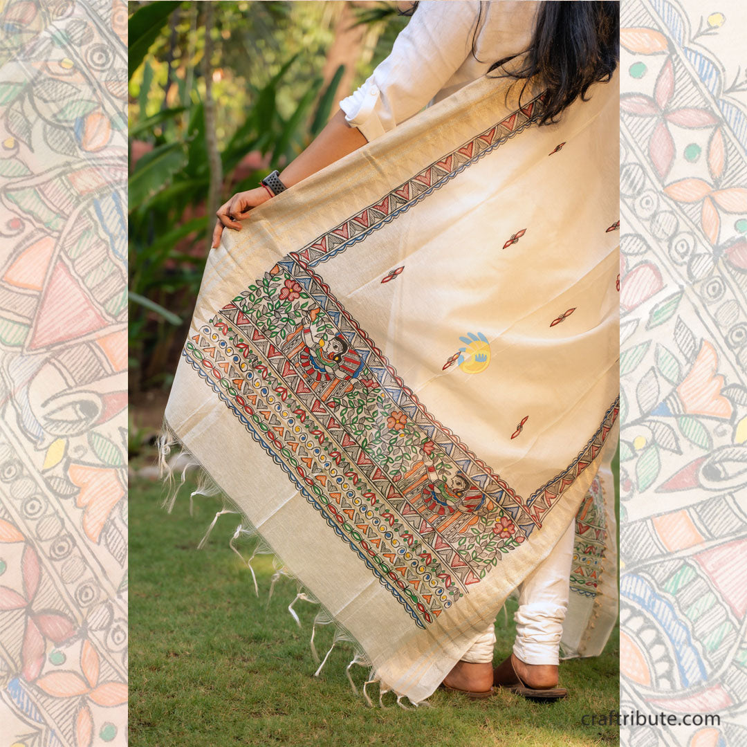 Madhubani hand painted Cotton Silk Dupatta – Gopi Temple Border
