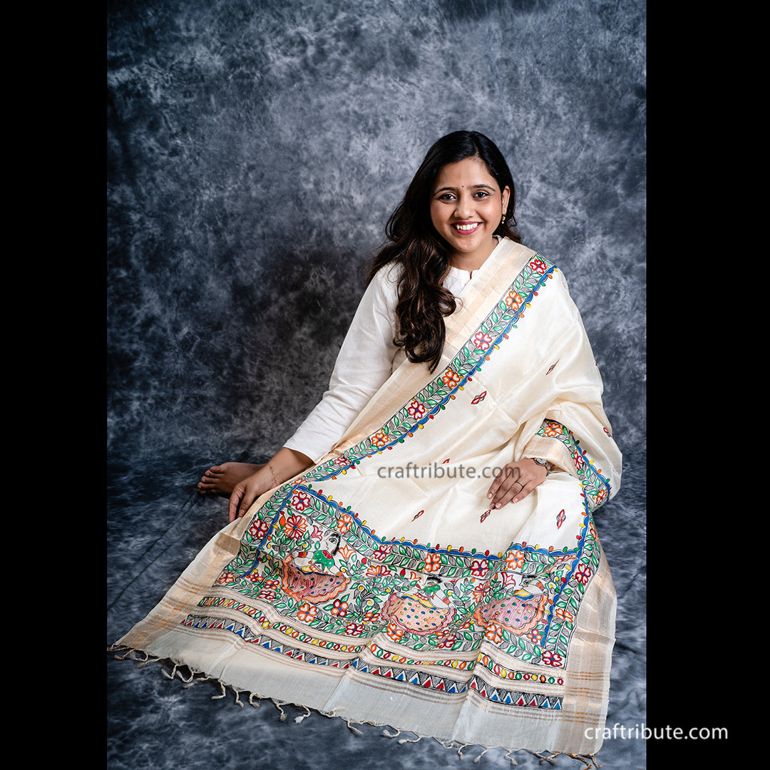 A beautiful piece of Kosa silk (from Vidarbha, India) dupatta hand painted by skilled artisans from Madhubani, Bihar. Milkmaids (Gopi) from Brindavan dancing in joy celebrating life. A wardrobe essential which can be paired with a white or beige kurta for the classic look!
