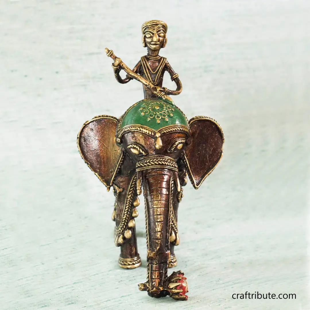 Handcrafted Dhokra Royal Elephant with a rider. Elephant back and head is decorated with delicate ornaments. Enjoy the intricate craftsmanship from the skilled craftsmen from Bastar, Chhattisgarh.