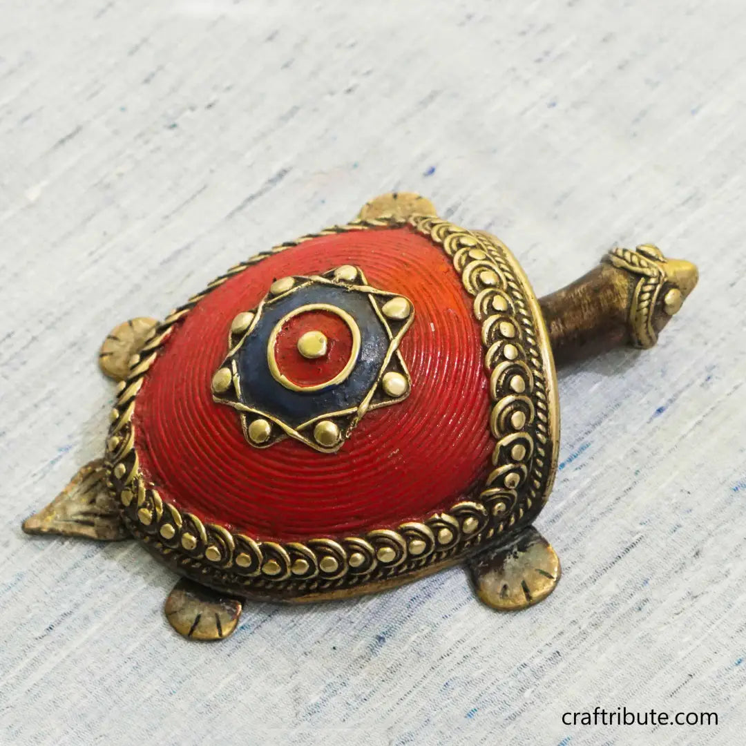 Beautiful decorative Dhokra Feng Shui Tortoise handmade by tribal artisans from Bastar, Chhattisgarh. Attractive colours and top notch finishing makes it an attractive decor and gift options.