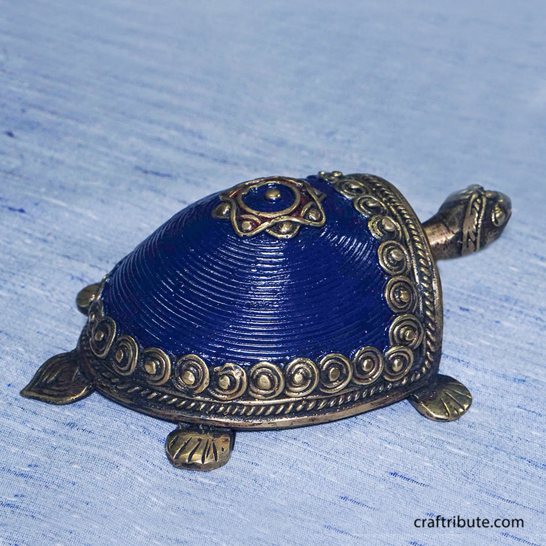 Handcrafted Brass Feng Shui Tortoise | Craftribute | Dokra Art | 8 cm x 13 cm - Blue is backordered and will ship as soon as it is back in stock.