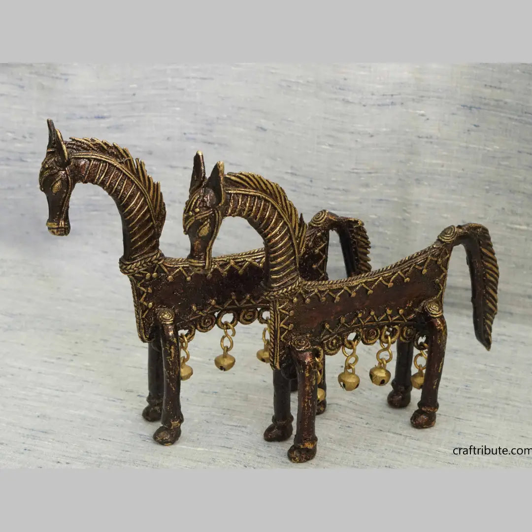 Handcrafted Dhokra decorative horse pair with Ghungru. Attractive shape of this artefact makes this interesting decor choice. Enjoy the intricate craftsmanship from the skilled craftsmen from Bastar, Chhattisgarh.