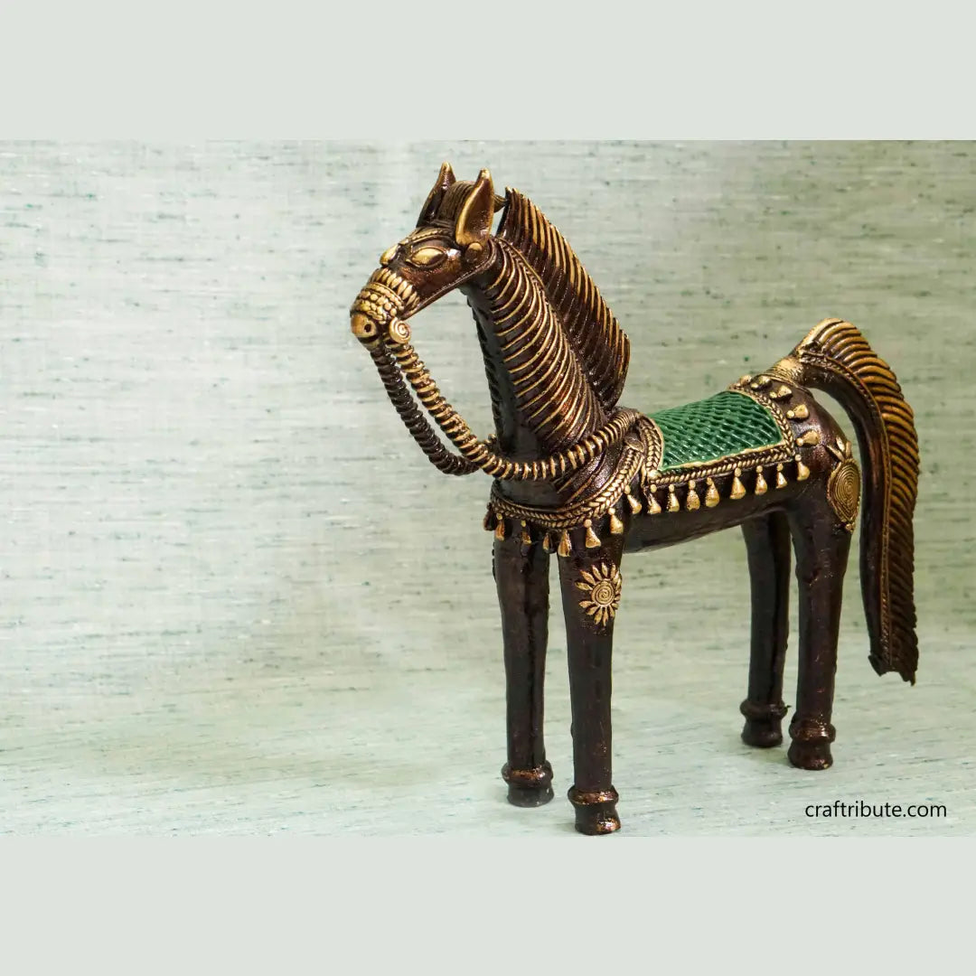 Handcrafted Dhokra decorative horse with a bright green ornamented saddle.