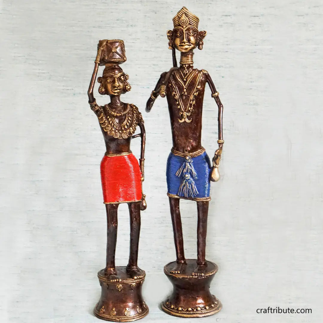 Handcrafted Dhokra/ Dokra (Bell Metal) figurines- tribal couple in the traditional attire. Minute details of facial gestures, hair, clothing and accessories have been given elaborate attention. Enjoy the beauty of this simple, yet elegant statues crafted by skilled artisans from Bastar, Chhattisgarh.
