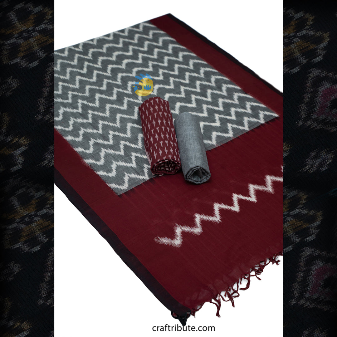 Pochampally Double Ikat Cotton Dress Material With Dupatta | Craftribute | Maroon & Grey | Paagadu Bandhu Handloom