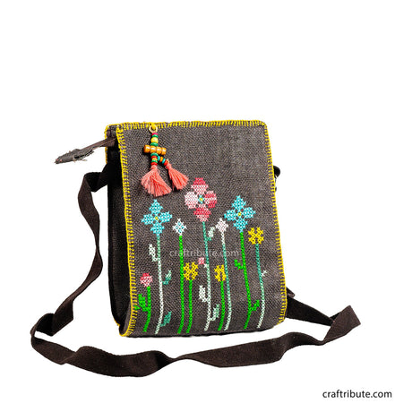 Jute Sling Bag With Tribal Hand Embroidery | Kamli Tribes | Yellow & Grey | 19 cm x 23 cm