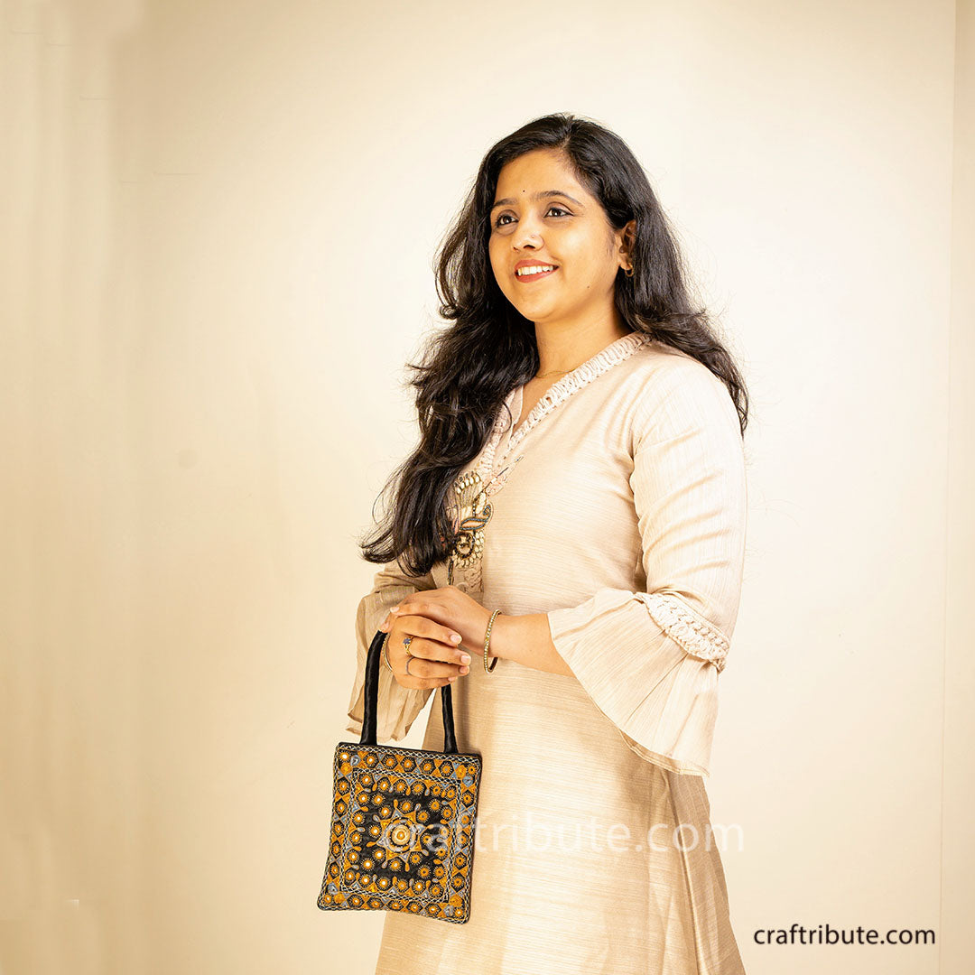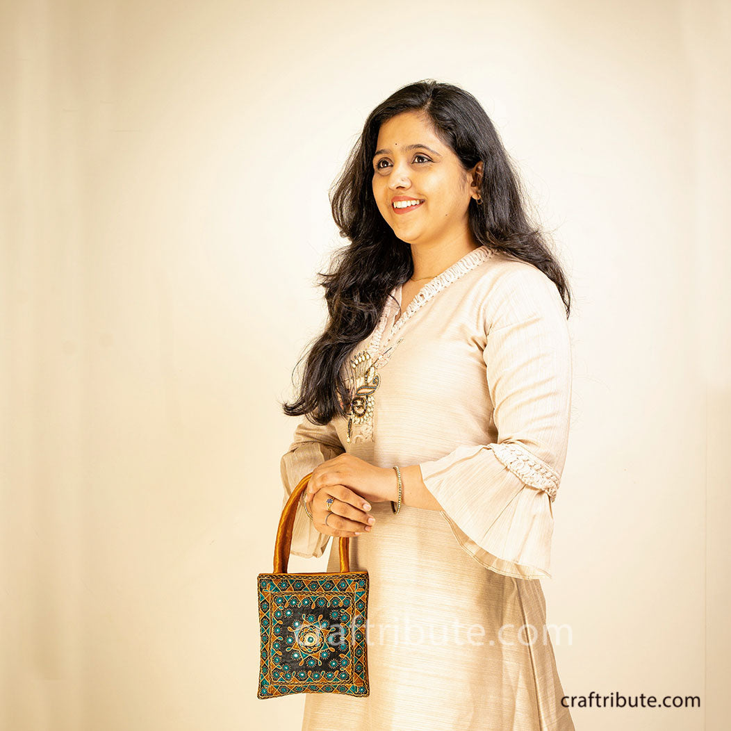 This beautiful and chic handbag with ‘Shining Star’ design has been hand embroidered in Pakko style by craftswomen of the Meghwal Marvada community. Attractive colour combinations, intricate designs and the overall finishing of the bag makes it a perfect choice of handbag for your party wear!