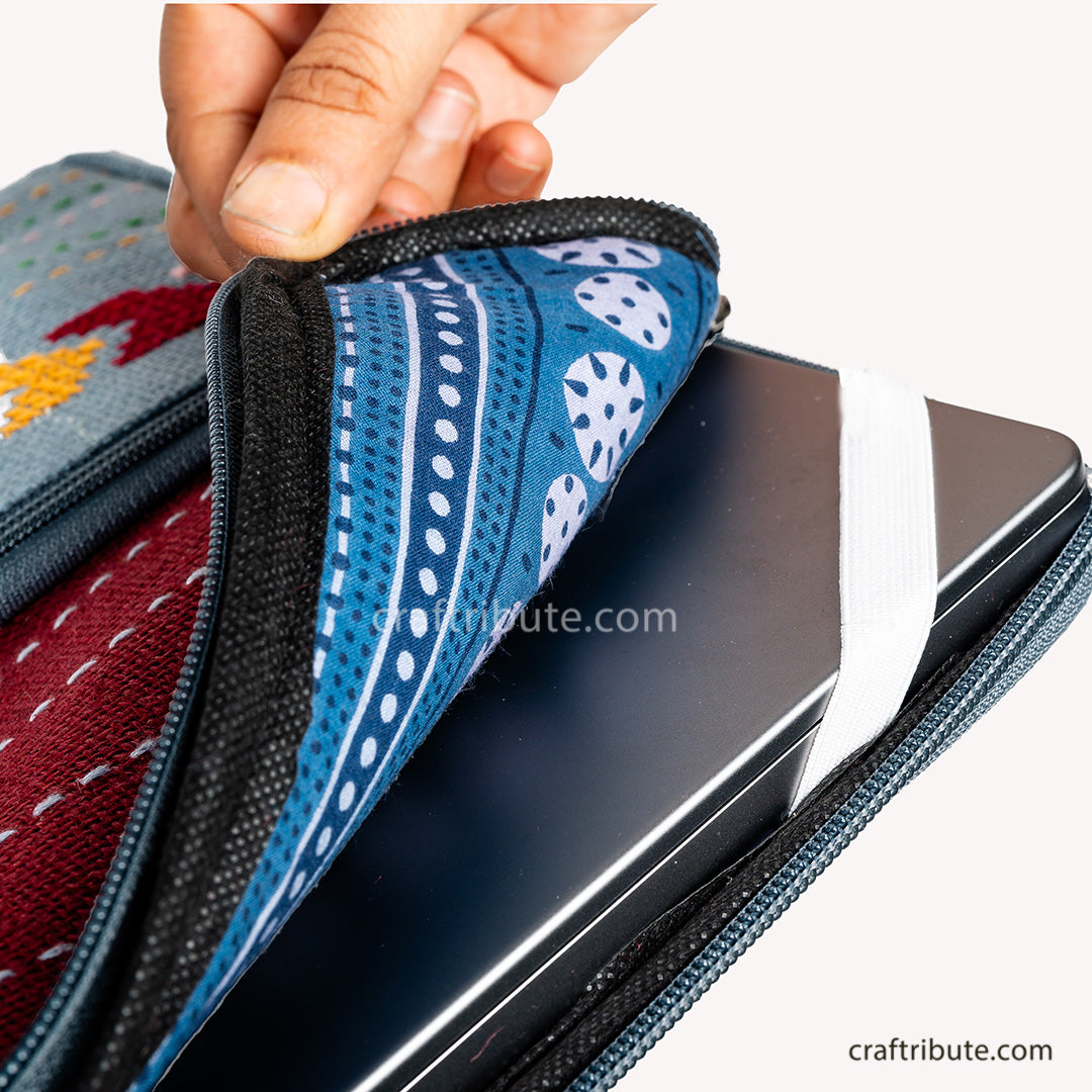 This attractive laptop cover with humble yet elegant design has been hand embroidered by tribal craftswomen of Rajasthan. A classic combination of red & grey is suitable for personal as well as corporate gifting.