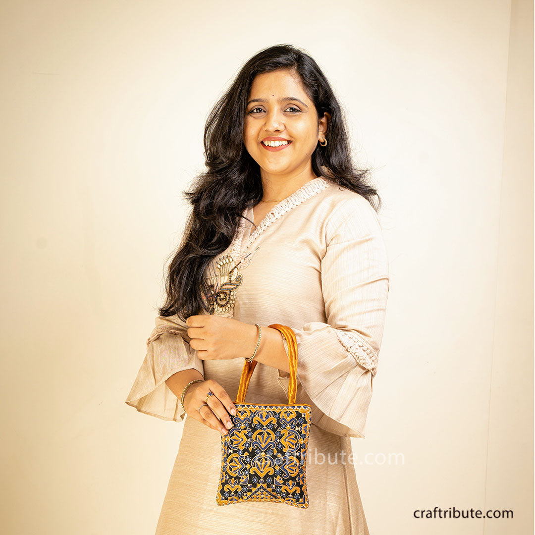 This beautiful and chic handbag with ‘Flowers’ design has been hand embroidered in Pakko style by craftswomen of the Meghwal Marvada community. Attractive colour combinations, intricate designs and the overall finishing of the bag makes it a perfect choice of handbag for your party wear!