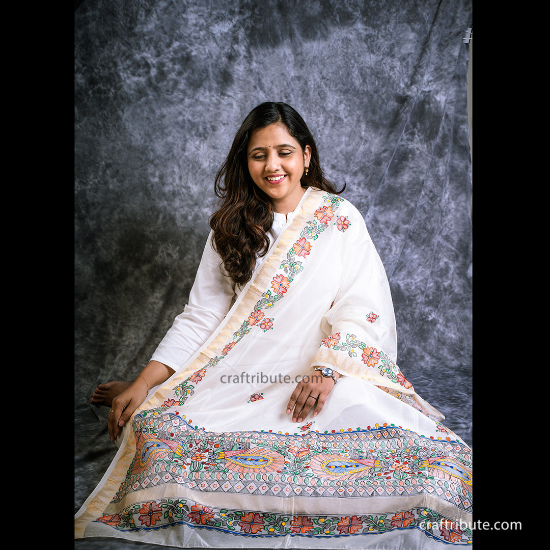 Madhubani Hand Painted Chanderi Silk Dupatta | Craftribute | Colourful Peacocks | 91 cm x 251 cm
