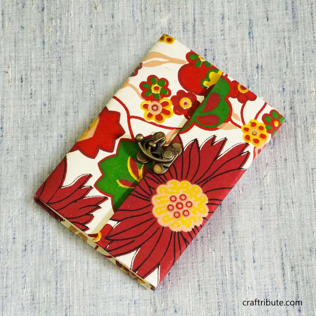 Handmade paper notebook with lock with attractive red & white floral design. Notebook is made from 100% recycled, tree-free paper.
