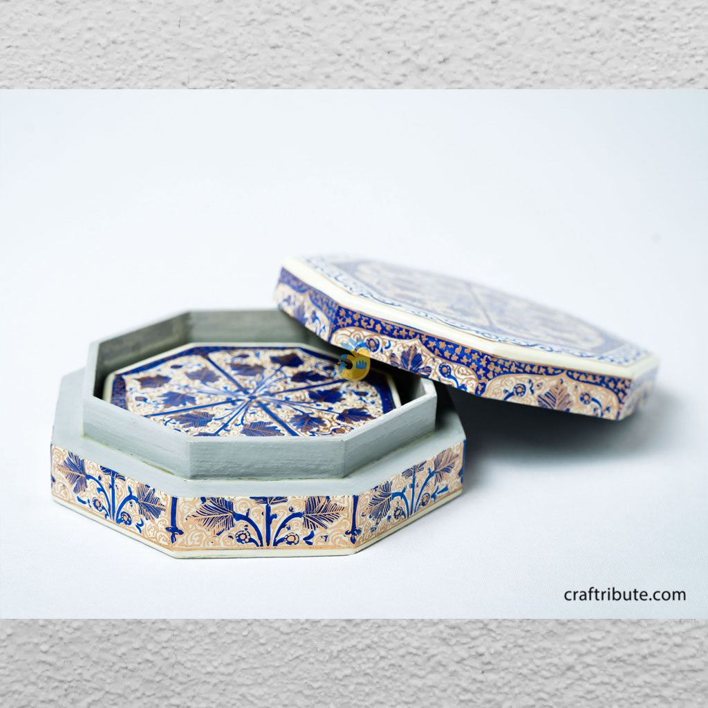 This hand crafted coasters set with beautiful Chinar design has been hand painted by skilled artisans (known as Naqash) from the valley of Kashmir! This coaster set consists of 4 coasters and a box. Naqashi is traditional craft of Kashmir. Beautiful and intricate designs inspired by the local flora and fauna is the speciality of this craft. These days through design interventions, artisans are incorporating new designs and concepts.