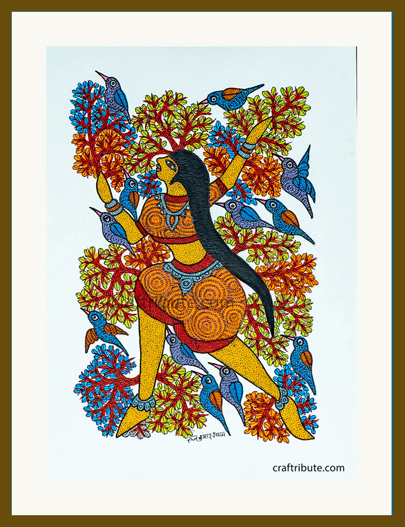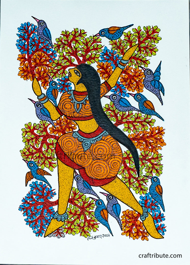 Today’s Gond paintings are contemporary expressions of the tribal wall paintings practiced by the Gond tribe in Madhya Pradesh and bordering areas of Maharashtra, Andhra Pradesh.This tribal Art is world famous for the beautiful forms of trees, animals and birds. Because of the vibrant colours and intricate textures which derive its inspiration from traditional tattooing designs (Gondana). Gond Paintings are eye catchy and loved by art connoisseurs across the world!! Tribal way of life is deeply rooted in nature and it’s no surprise that the trees and the wildlife around are still the chief source of inspiration for the tribal artists.