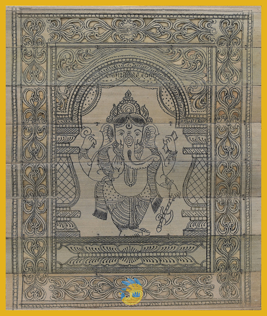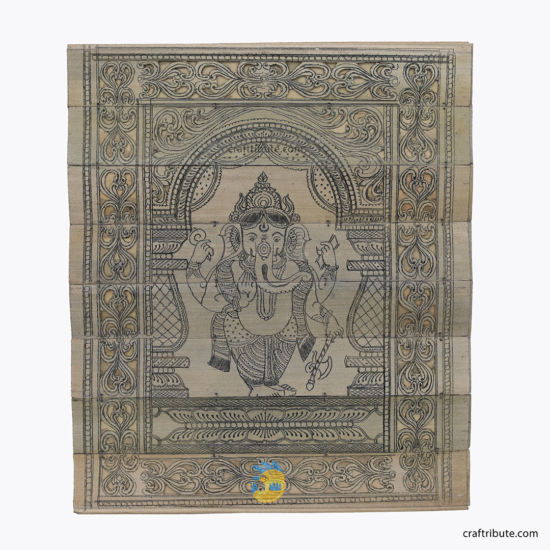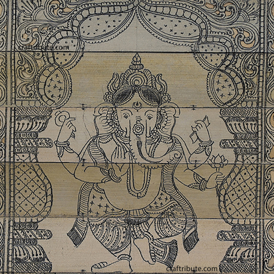 This intricate Palm Leaf Painting (Talapatra Chitra) depicting Lord Ganesha in standing posture is a unique piece of art that represents the sacred traditions of Odisha. It's also known as Devakala as the subjects primarily draw its inspiration from Vedas and Puranas.