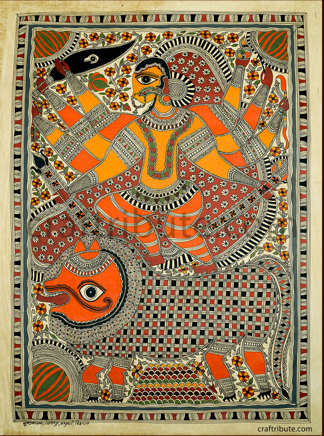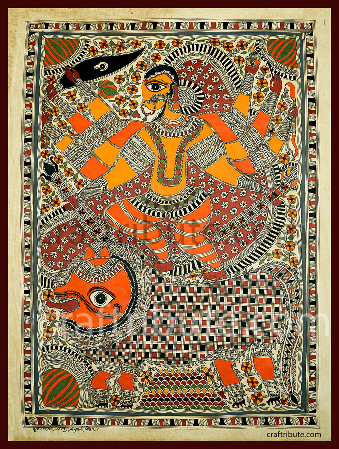 his is a beautiful Bharni (Fill in colours) style of Madhubani painting. This painting depicts the fierce form of Devi riding on the lion. Outlines in the painting are done directly using a brush (There are no pencil sketches; no geometry tools like rounder or scale are used). It originates from the Mithilanchal region of Bihar, India, also known as Mithila paintings.