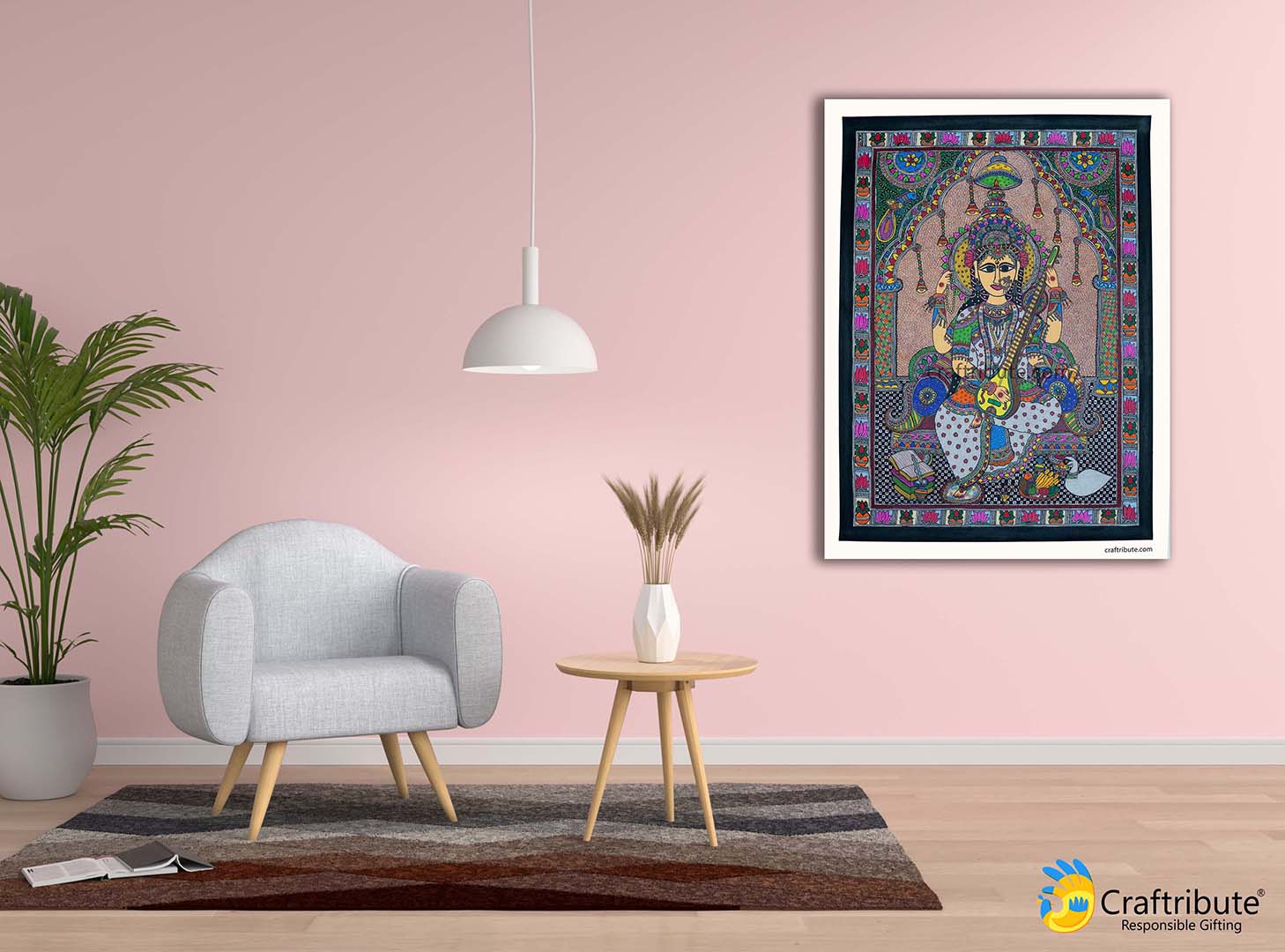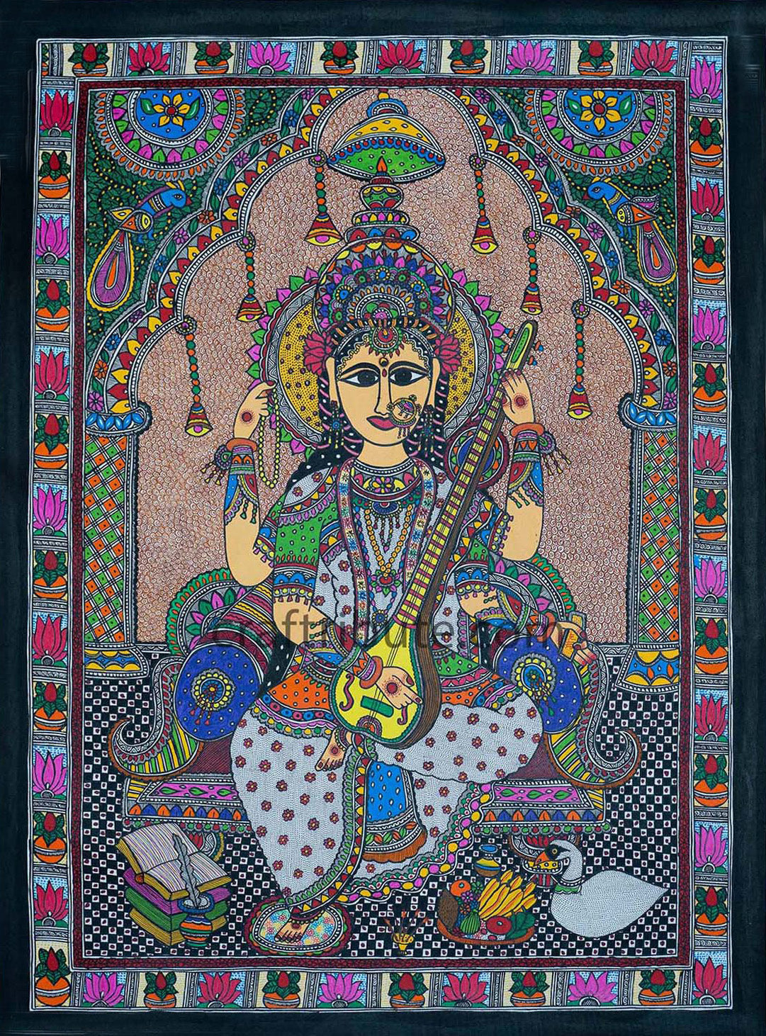 Folk Art Madhubani Painting | Craftribute | Goddess Saraswati | Wall Decor - 57.5 cm x 76.5 cm