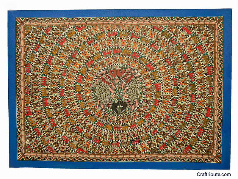 Authentic Madhubani/ Mithila paintings are free hand paintings done using a brush or a nib. No geometric tools are used to draw straight lines or circles etc. Asymmetries and imperfections that celebrate the human genius make Madhubani paintings so special!