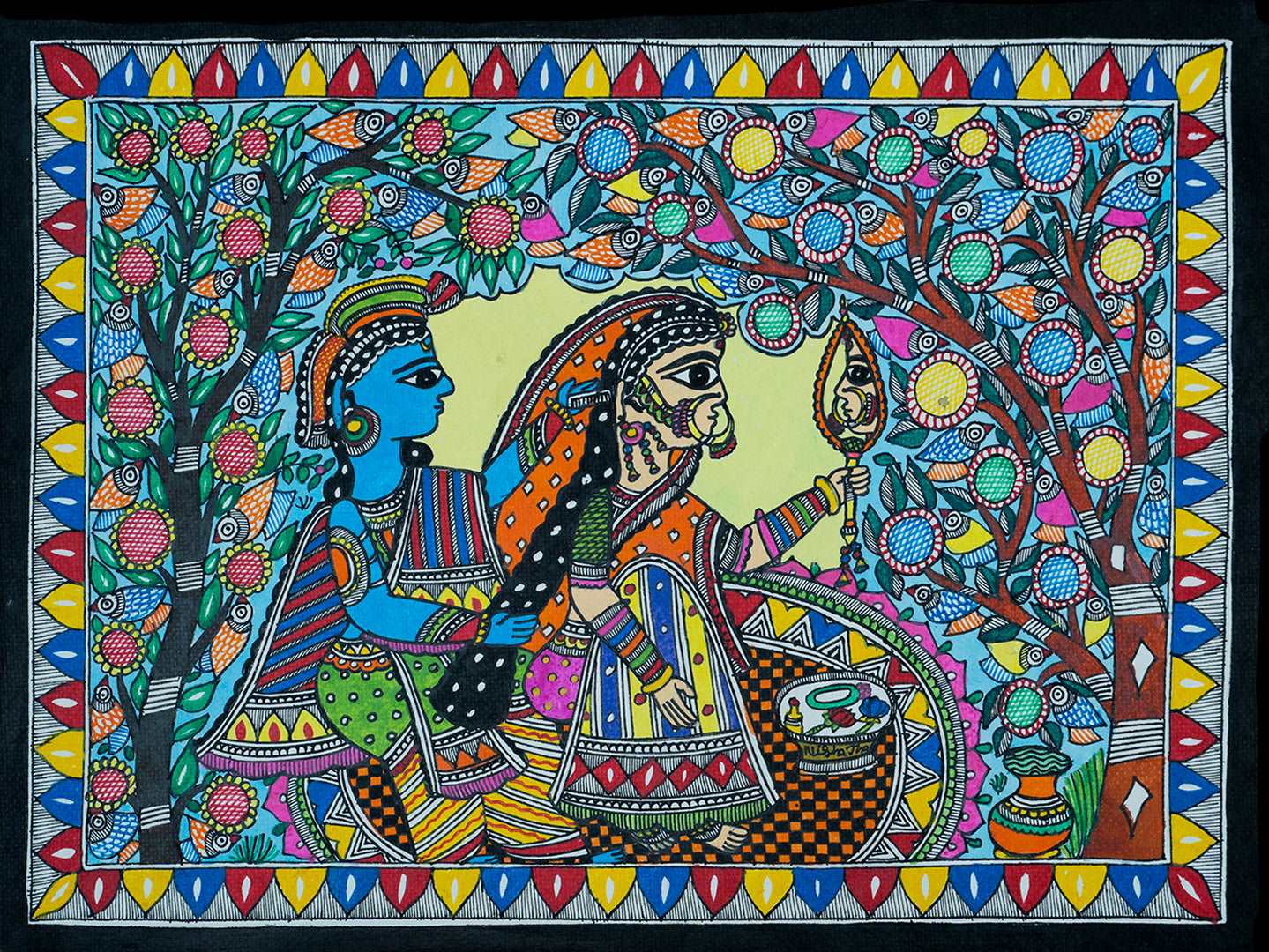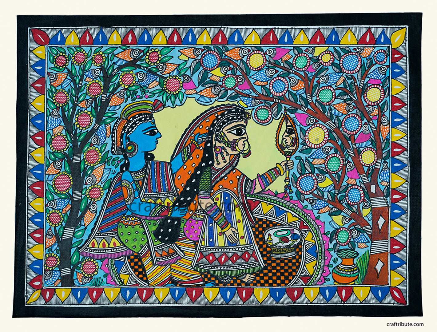 Folk Art Madhubani Painting | Craftribute | Radha Krishna Reflection | Wall Decor - 38.5 cm x 28 cm