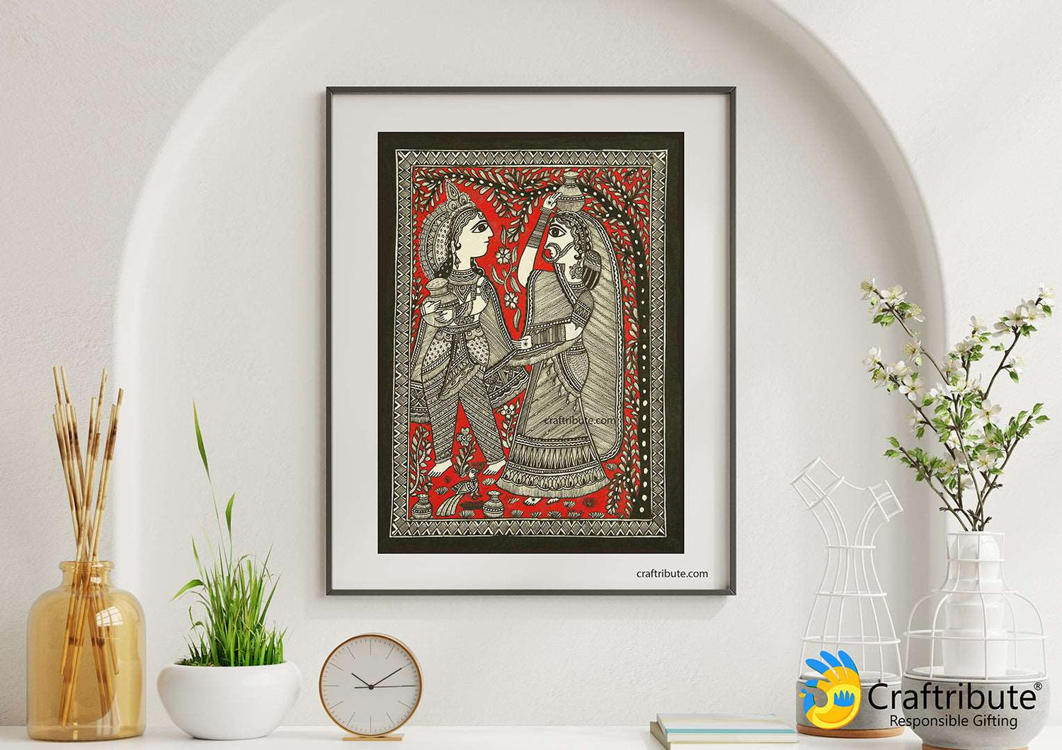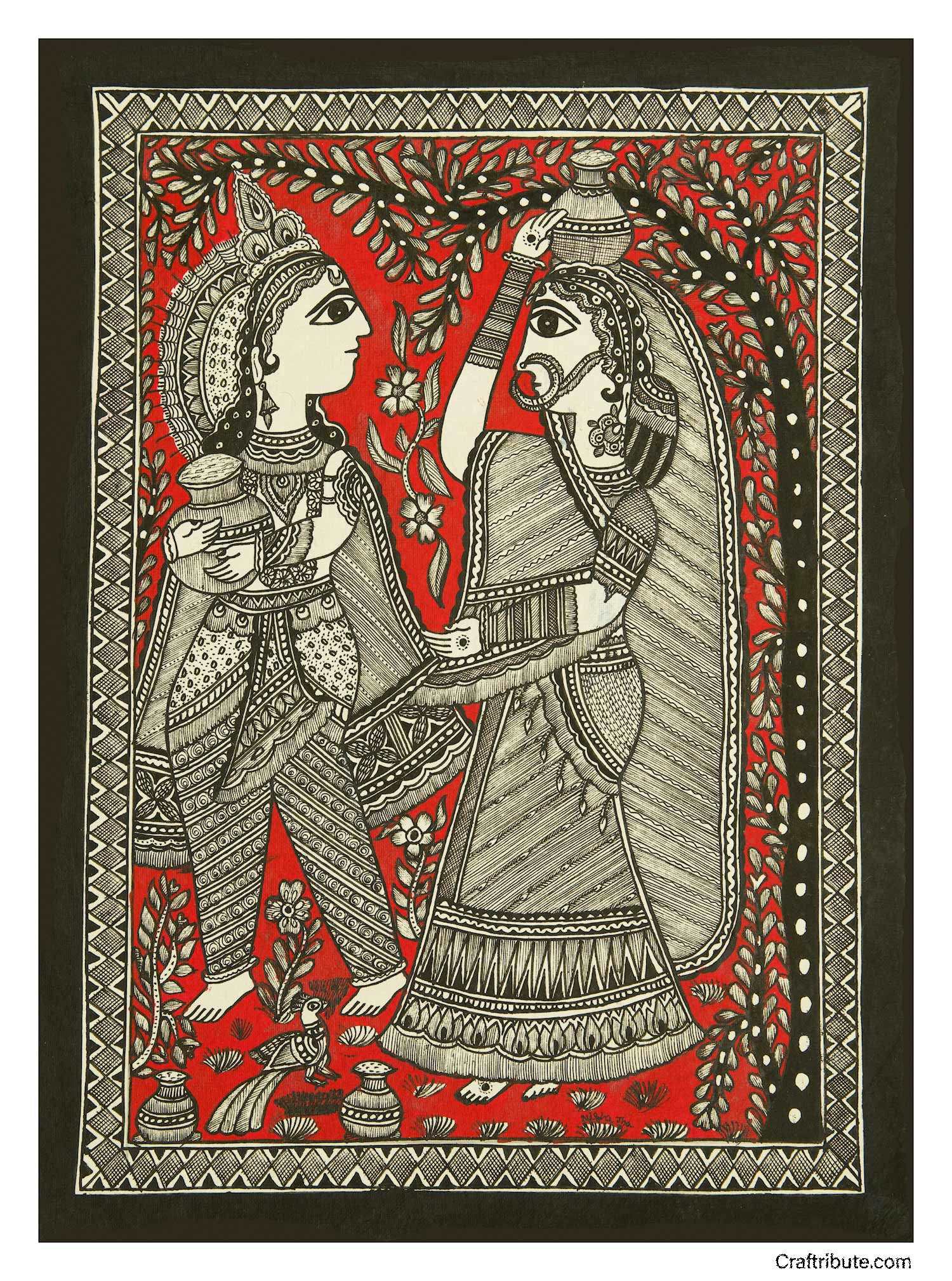 Madhubani paintings also known as Mithila paintings is the famous folk art from Mithilanchal Region of Bihar, India. Folklore says that this art has been practiced since the days of Ramayana and walls were adorned with these paintings during Ma Sita’s wedding with Lord Ram. Traditionally Madhubani wall art used to be practiced by women on the external as well as internal walls of the house on auspicious occasions such as weddings and other celebrations. Known for its bold forms and vibrant colours, today, this wall art has transformed itself into one of the most celebrated folk art on paper and canvas and sought by art connoisseurs across the globe.