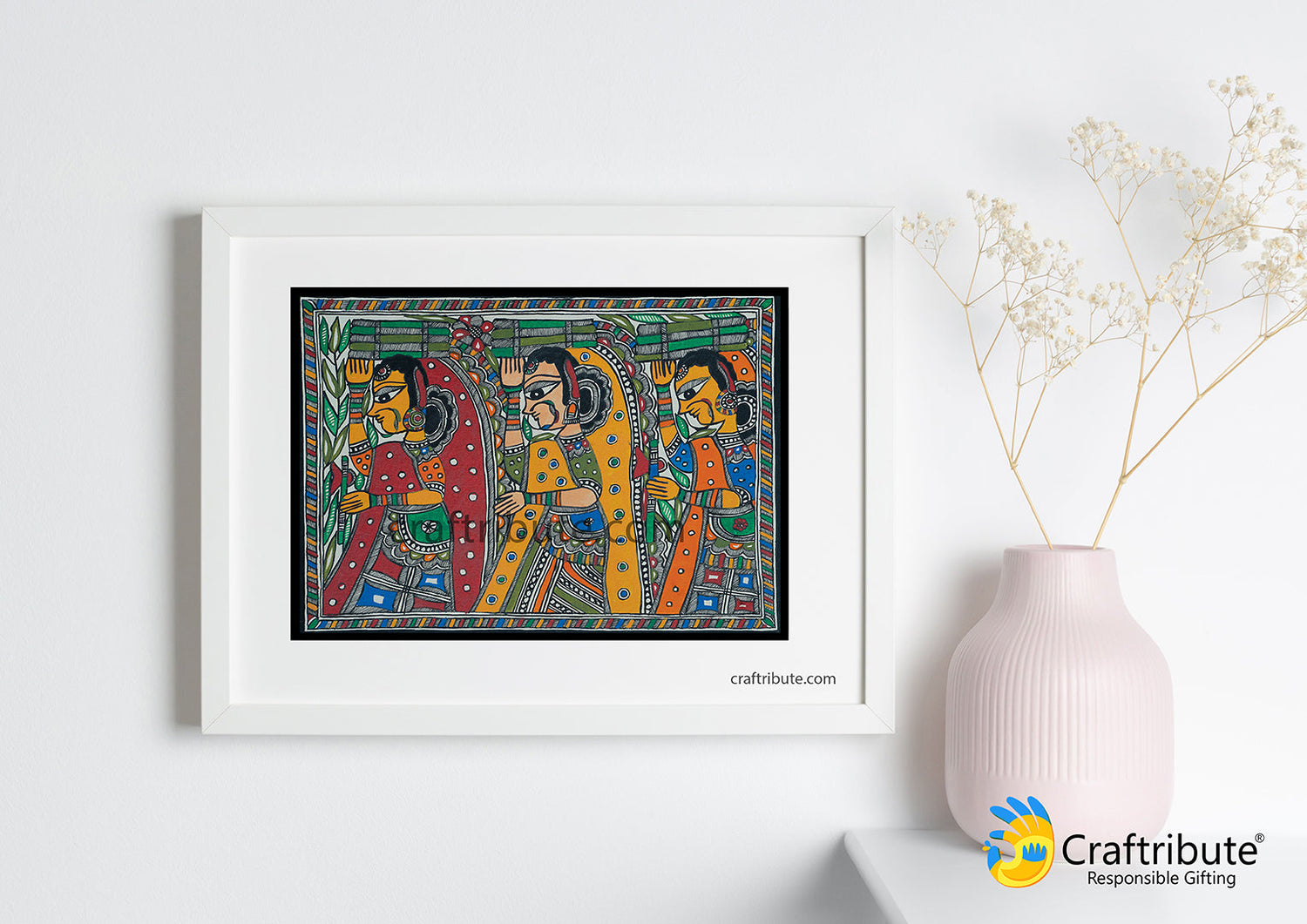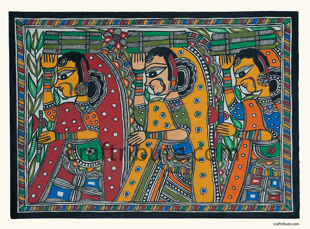 Folk Art Madhubani Painting | Craftribute | 3 Women | Wall Decor - 38.5 cm x 28 cm