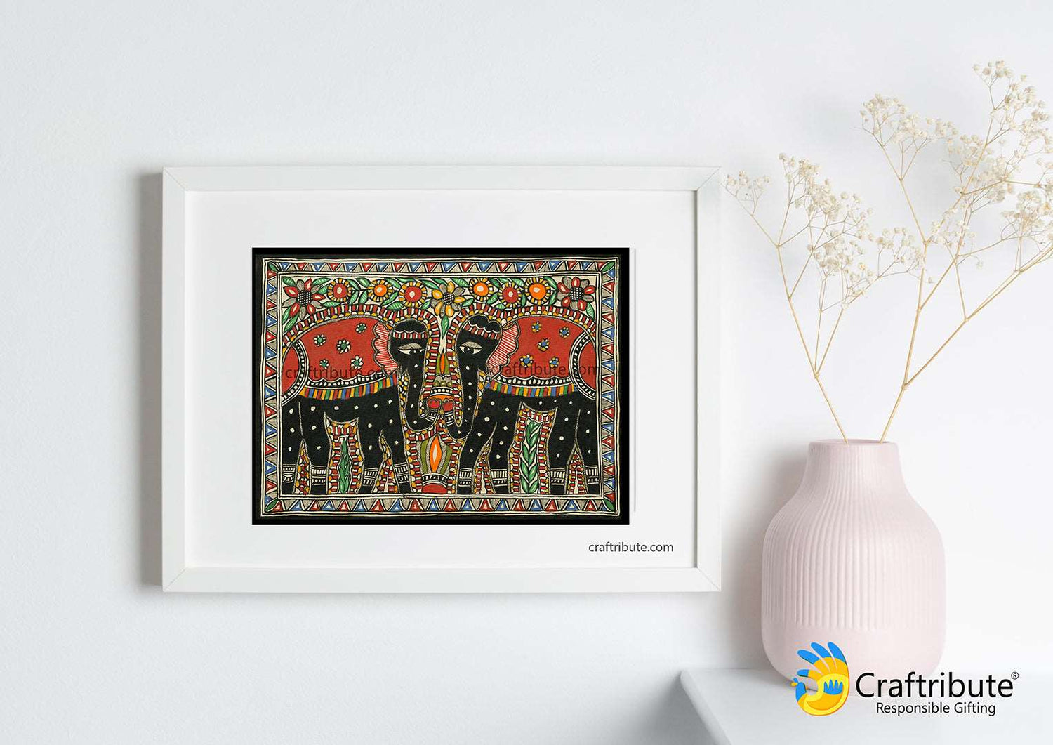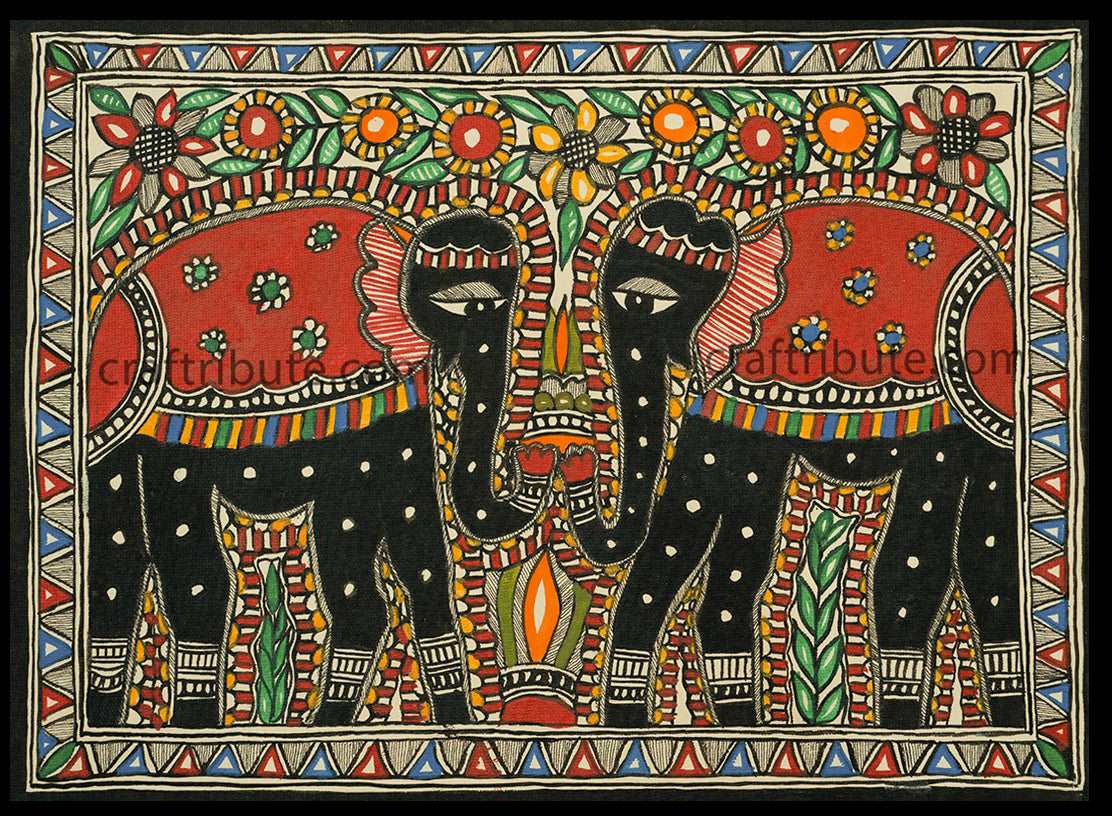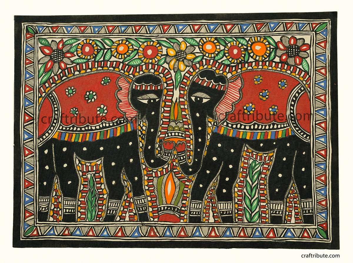 Folk Art Madhubani Painting | Craftribute | Two Elephants | Wall Decor - 38.5 cm x 28 cm