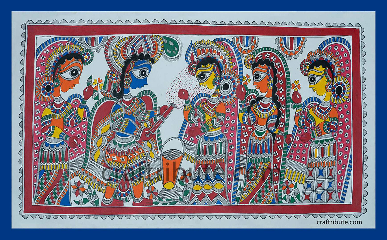 Folk Art Madhubani Painting | Craftribute | Radha Krishna playing Holi | Wall Decor -77 cm x 44 cm