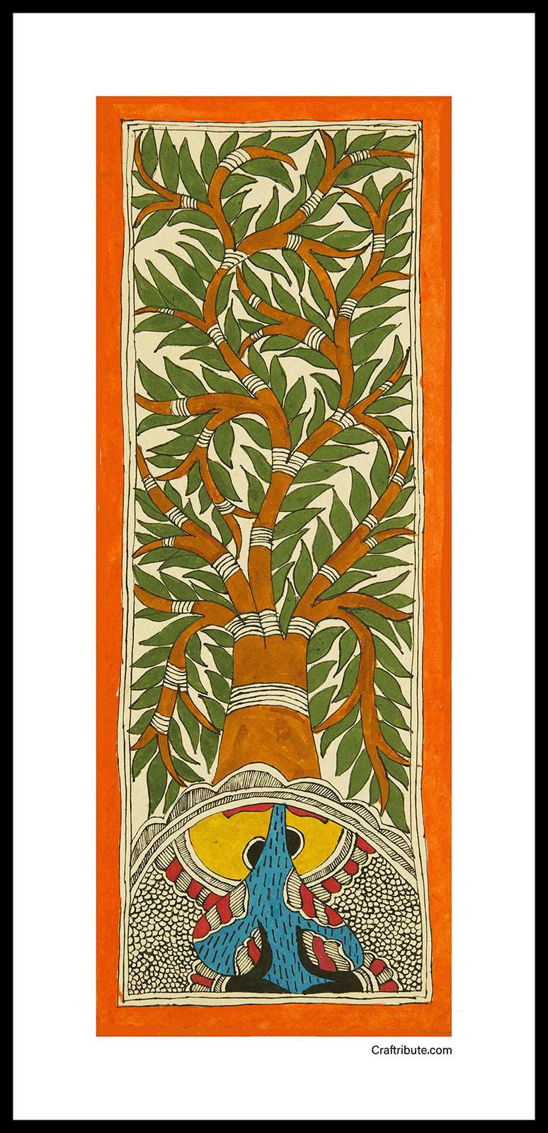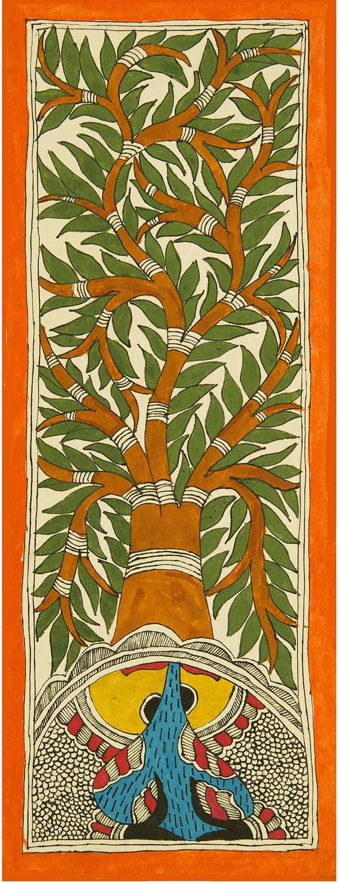 This beautiful painting is a classic example of the Bharni (fill in colours) style of Madhubani painting depicting the tree of life. It originates from the Mithilanchal region of Bihar, India. A sketch is made freehand using a brush. A nib dipped in acrylic colour is used to draw fine lines (textures in a shape). It takes a skilled artist to make a flawless painting which catches one’s imagination with wide variety of fill in textures.