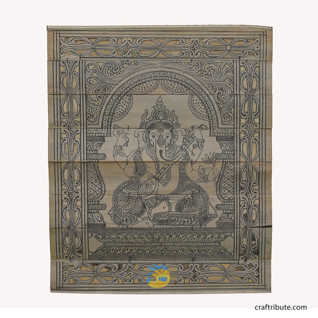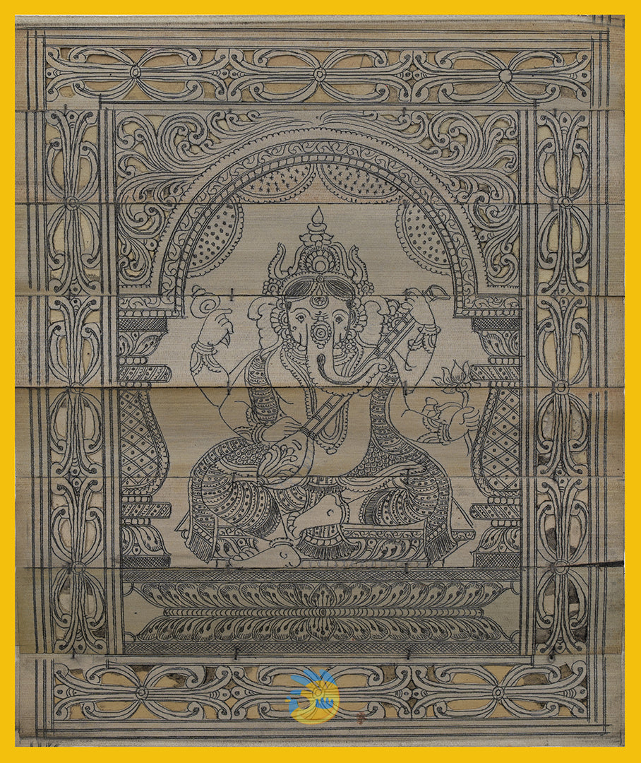 This intricate Palm Leaf Painting (Talapatra Chitra) depicting Lord Ganesha playing Veena (Indian Musical Instrument), is a unique piece of art that represents the sacred traditions of Odisha. It's also known as Devakala as the subjects primarily draw its inspiration from Vedas and Puranas.