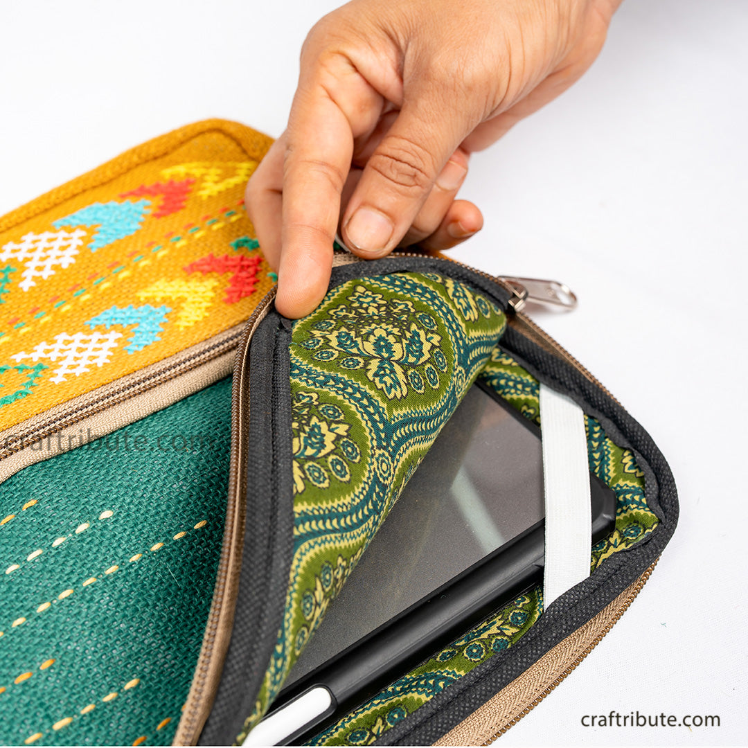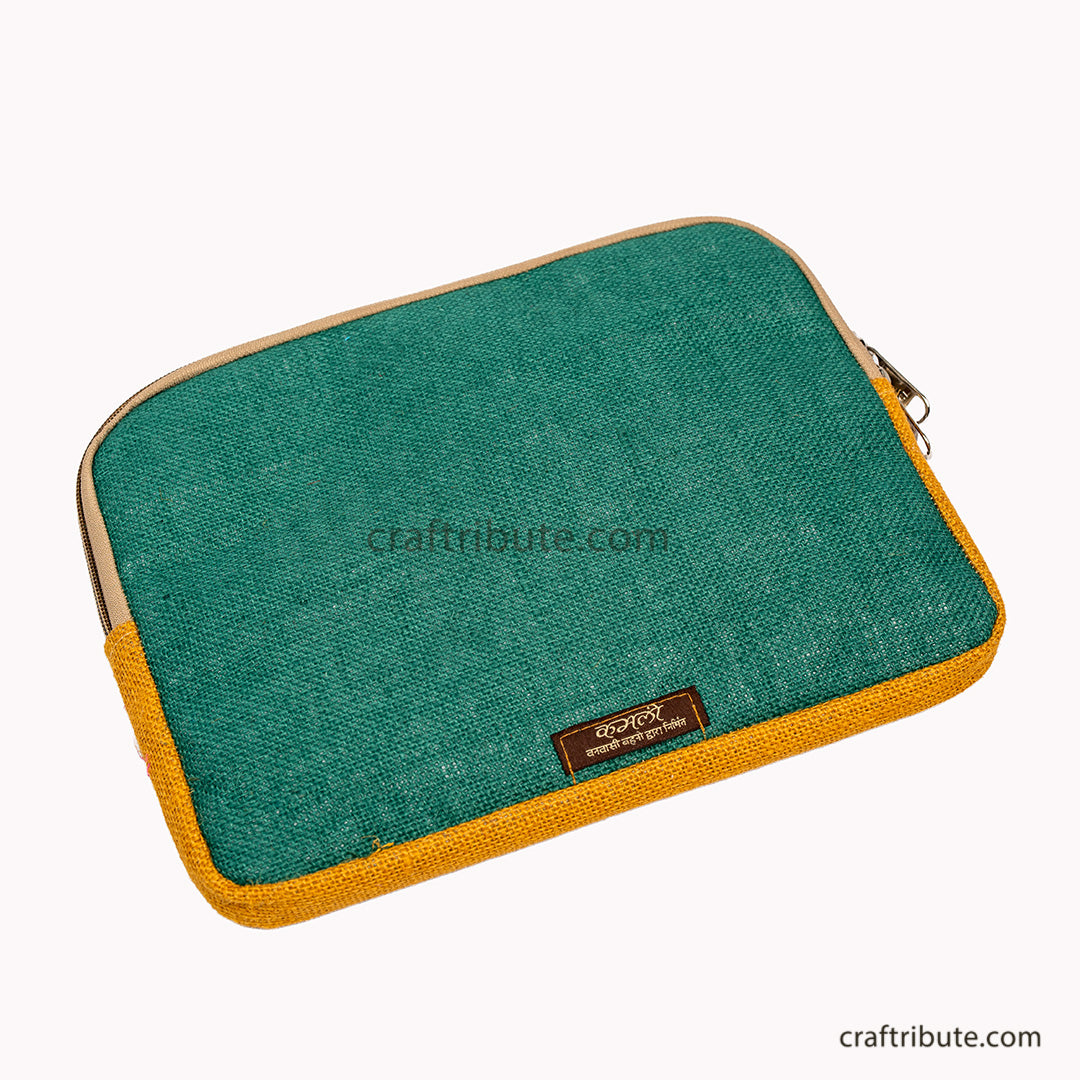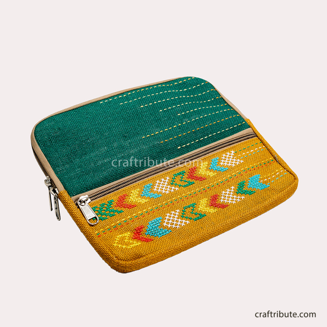 This attractive iPad/ tablet sleeve is made from hand embroidered jute panels. Vibrant combination of Green & Yellow with restrained embroidery design and sustainable material makes it ideal for personal as well as corporate gifting needs.