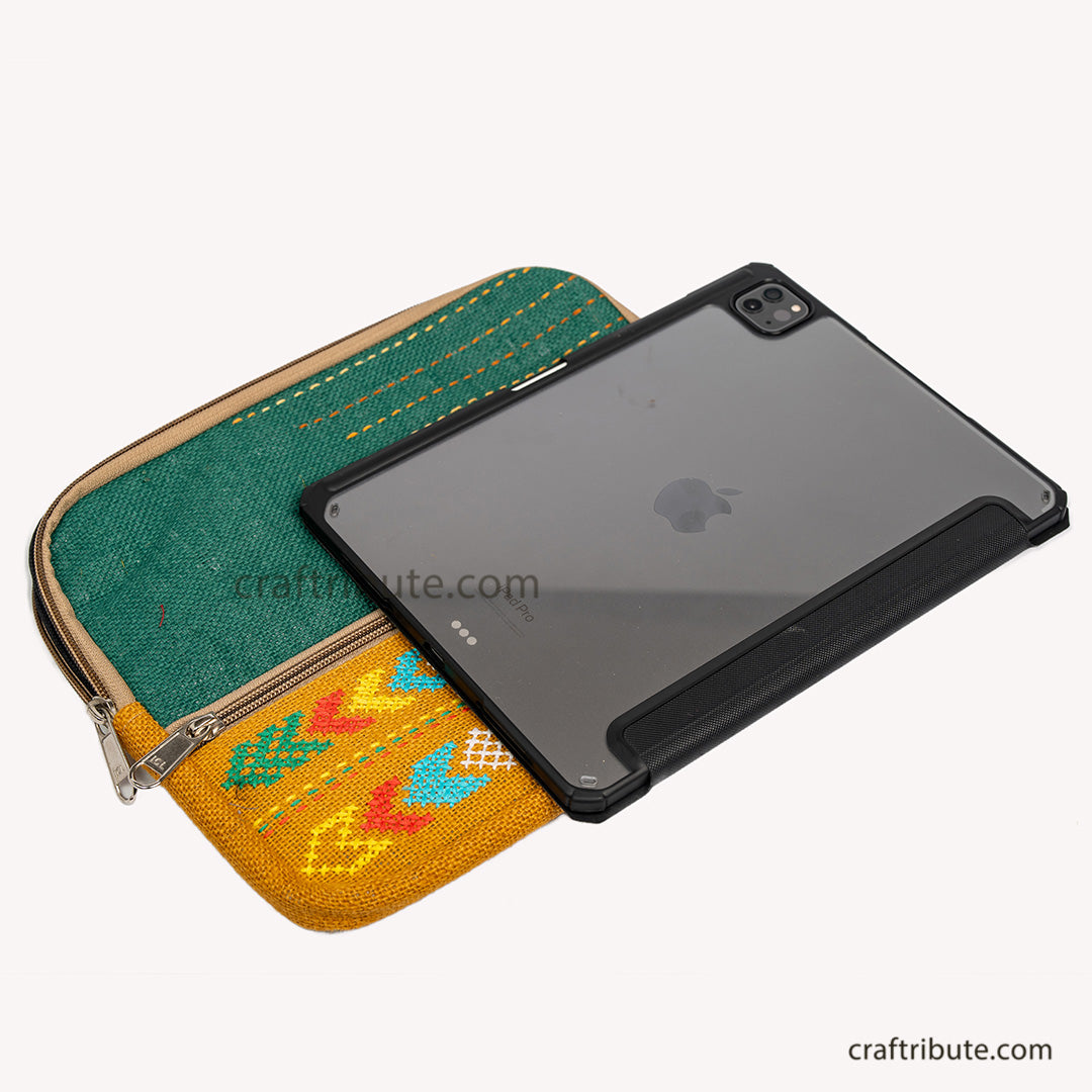 iPad Sleeve / Jute Tablet Bag With Hand Embroidery | Kamli Tribes | Green & Yellow - 27.5 cm x 21.5 cm - Green is backordered and will ship as soon as it is back in stock.