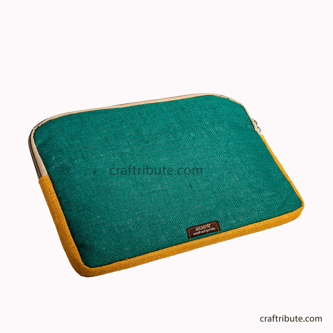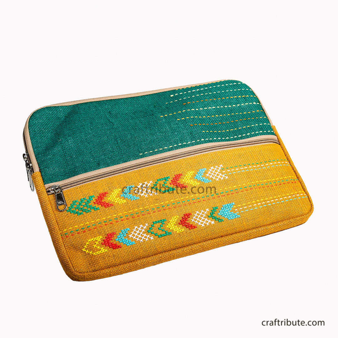Jute 15" Laptop Sleeve with Hand Embroidery | Kamli Tribes | Green & Yellow | 35.5 cm x 25 cm x 1.5 cm