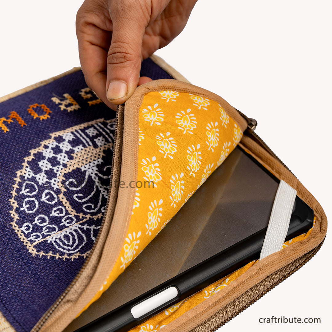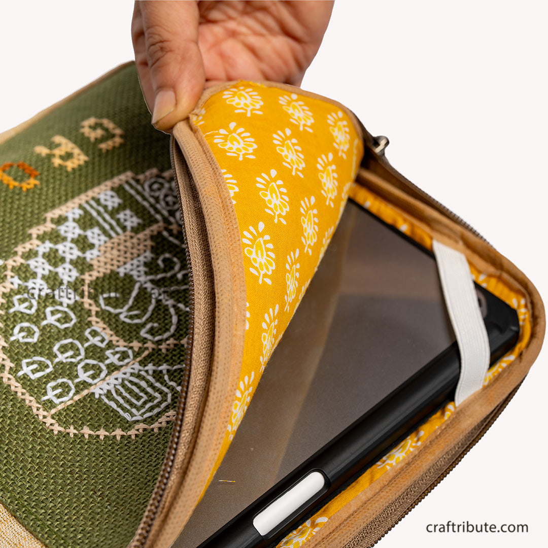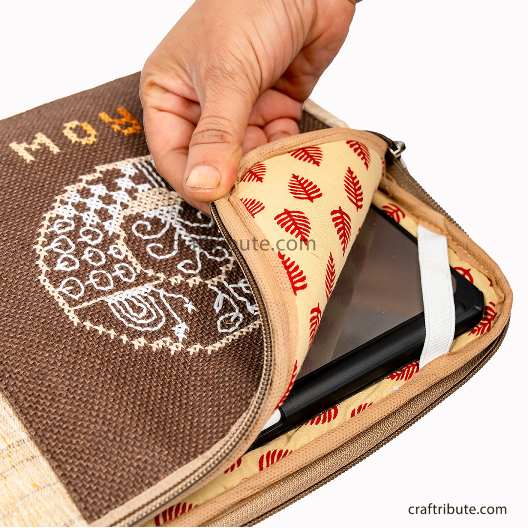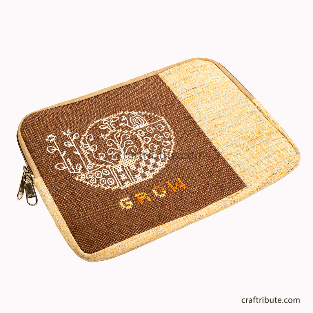 This attractive iPad sleeve is a beautiful combination of hand embroidered jute panel and cotton fabric. A classic combination of earthy colours & beige in the eco-friendly jute material is suitable for personal as well as corporate gifting.