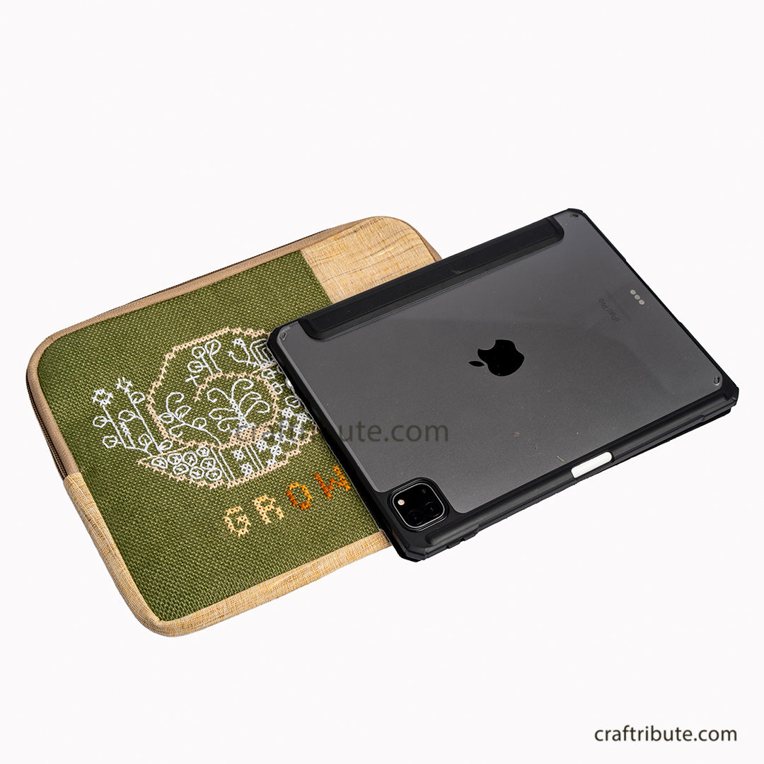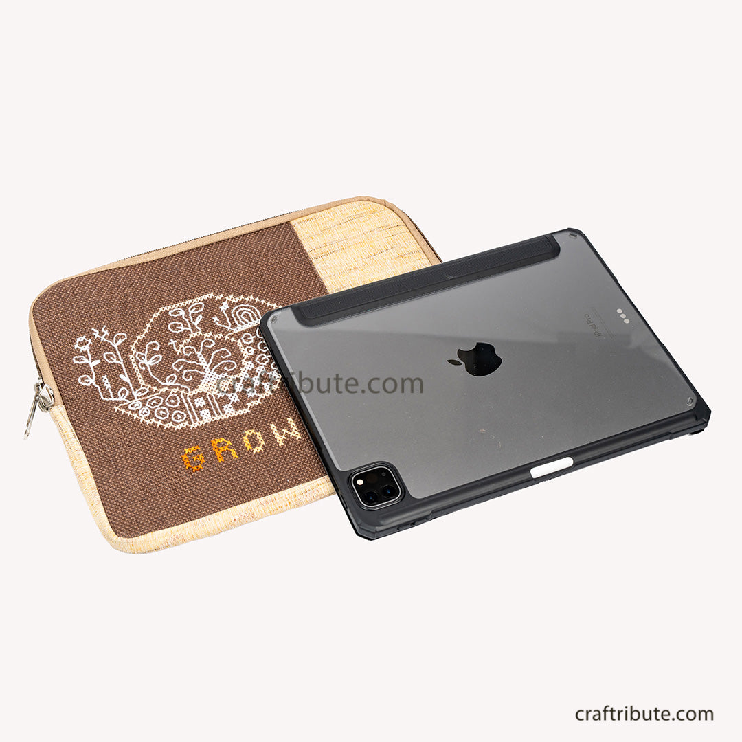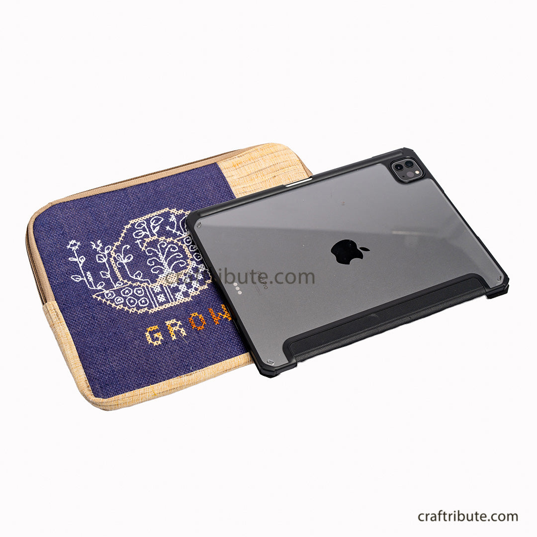 iPad Sleeve / Jute - Cotton Tablet Bag With Hand Embroidery | Kamli Tribes | Grow | 27.5 cm x 21.5 cm