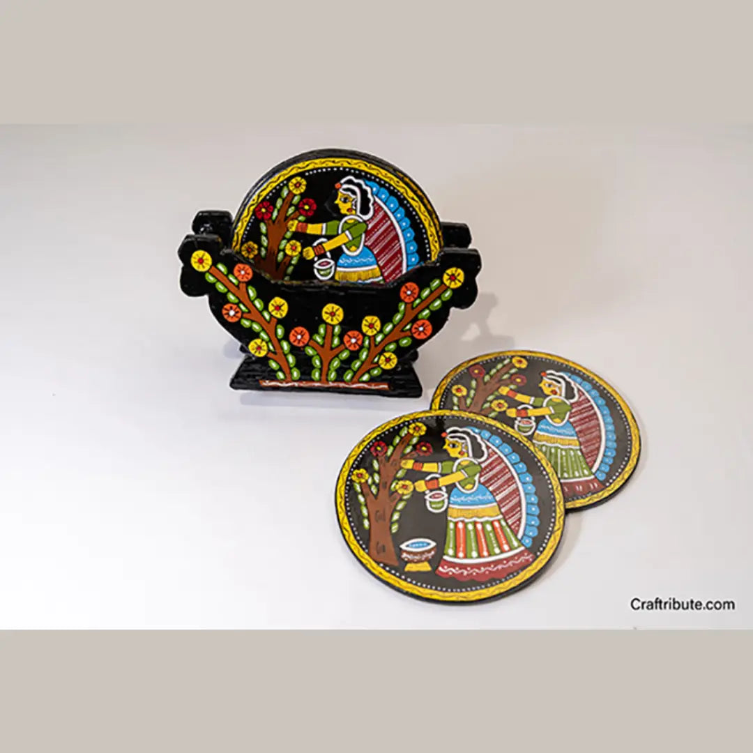Tikuli Handpainted coaster set from the hinterlands of India, Bihar. Tikuli is a traditional craft from Patna, Bihar and known for its intricate designs inspired from Madhubani paintings and bright colours.