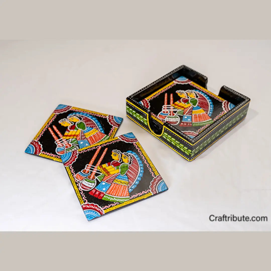 Tikuli Hand painted coasters set from the hinterland of India, Bihar. It can also alternately used as a tissue holder.