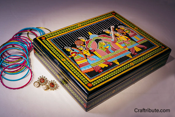 Tikuli Handpainted jewellery box from the hinterlands of India, Bihar. Tikuli is a traditional craft from Patna, Bihar and known for its intricate designs inspired from Madhubani paintings and bright colours.