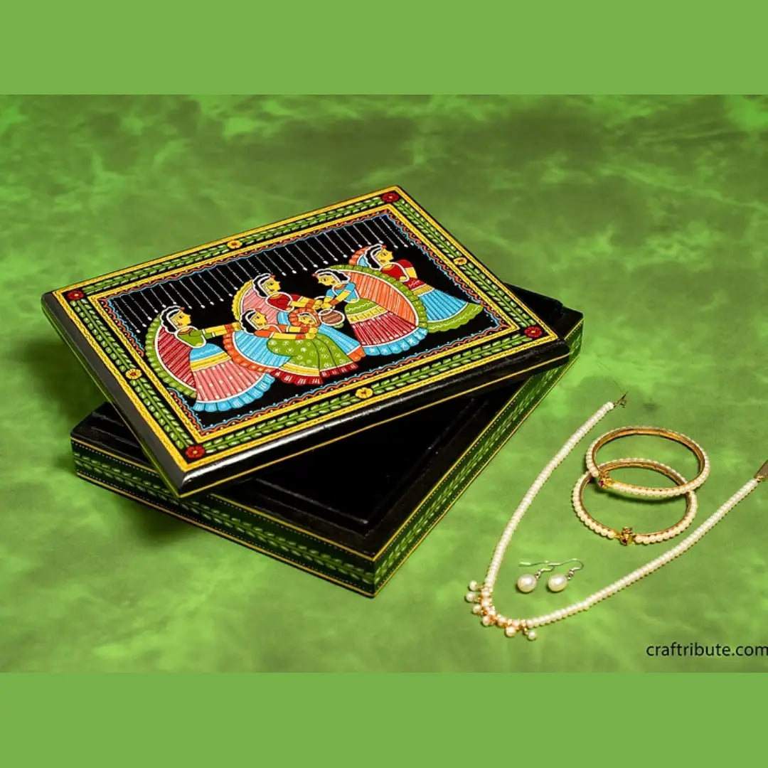 Tikuli Handpainted jewellery box from the hinterlands of India, Bihar. Tikuli is a traditional craft from Patna, Bihar and known for its intricate designs inspired from Madhubani paintings and bright colours.