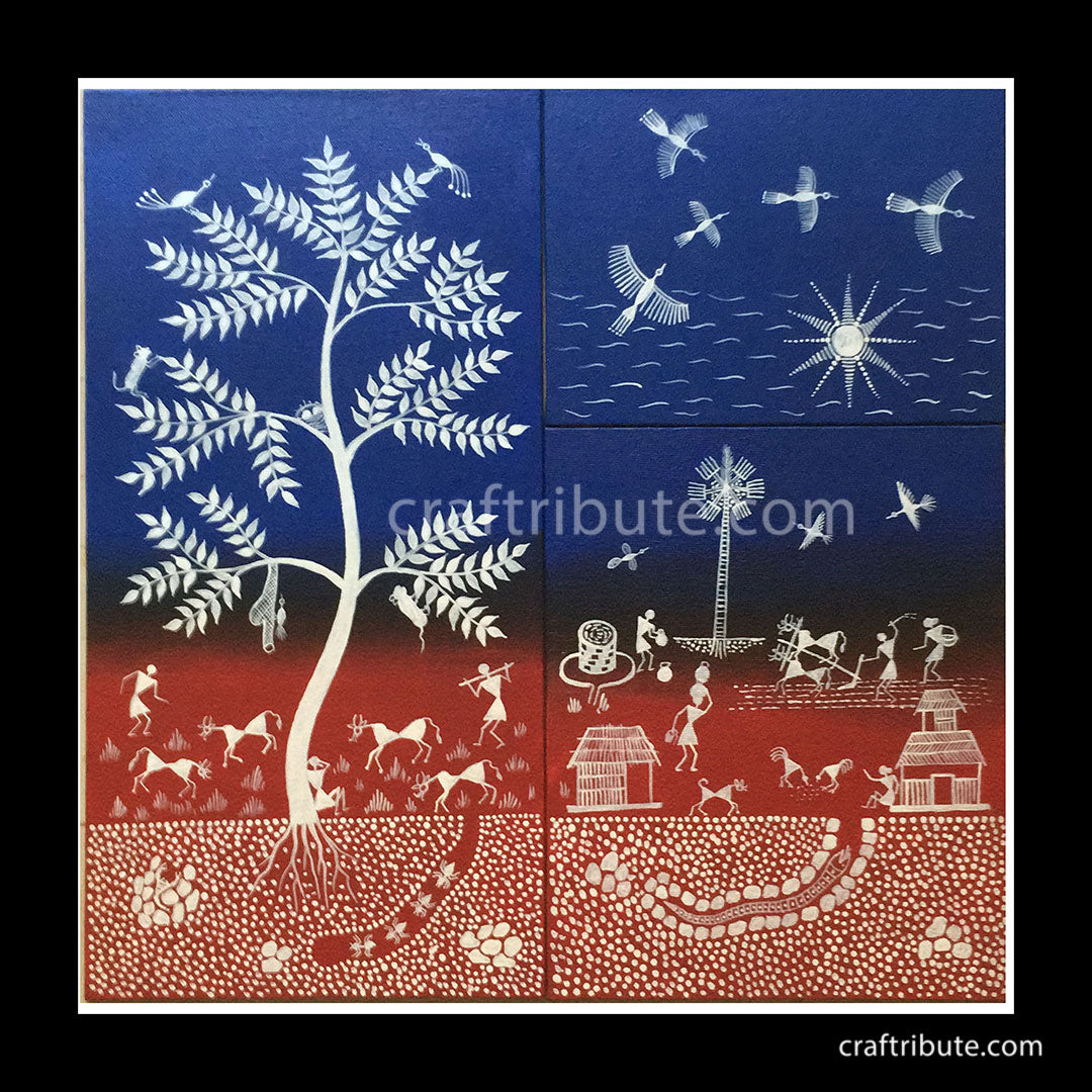 This Set of 3 Warli paintings depicts the inclusive ethos of a tribal culture! Smallest of the elements, may it be below the ground, on the ground or above is considered sacred and drawn with elaborate attention!