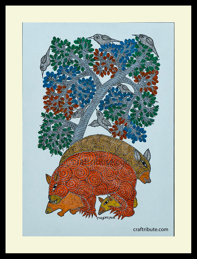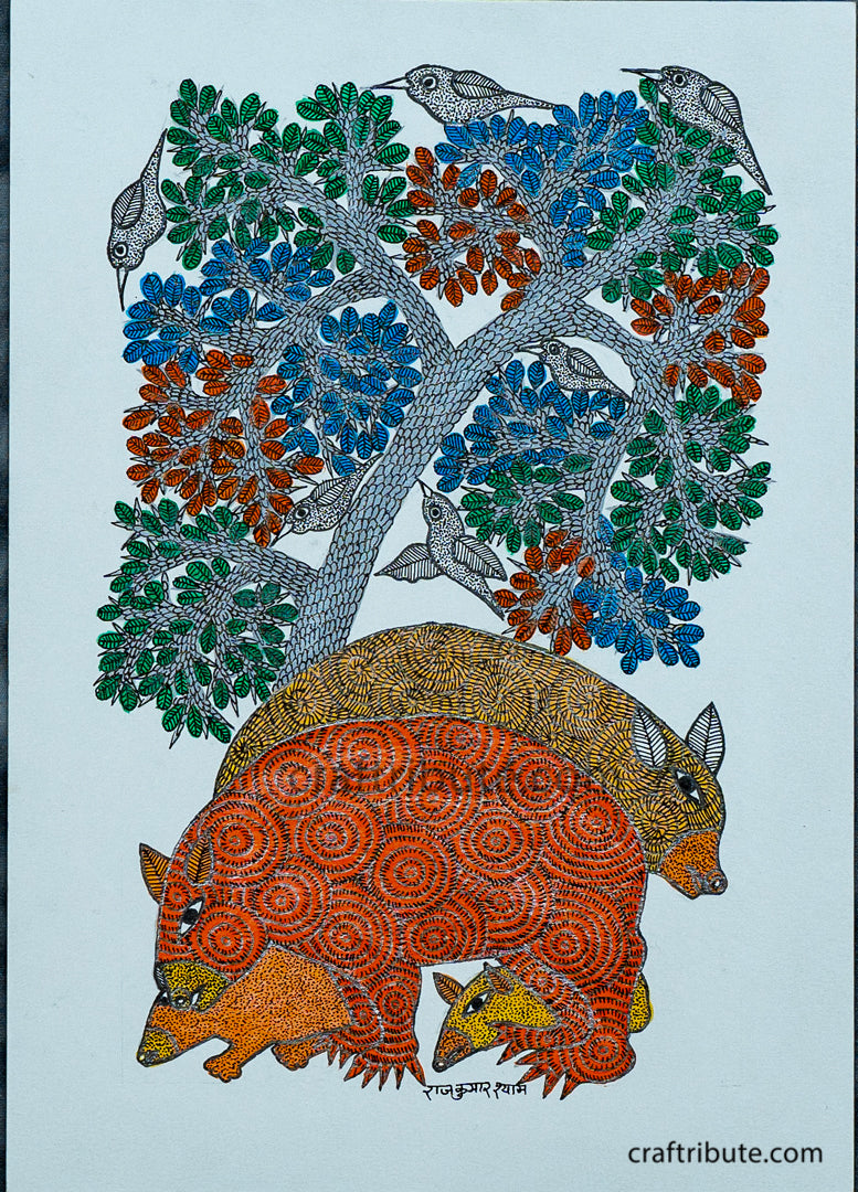 Today’s Gond paintings are contemporary expressions of the tribal wall paintings practiced by the Gond tribe in Madhya Pradesh and bordering areas of Maharashtra, Andhra Pradesh.This tribal Art is world famous for the beautiful forms of trees, animals and birds. Because of the vibrant colours and intricate textures which derive its inspiration from traditional tattooing designs (Gondana). Gond Paintings are eye catchy and loved by art connoisseurs across the world!! Tribal way of life is deeply rooted in nature and it’s no surprise that the trees and the wildlife around are still the chief source of inspiration for the tribal artists.