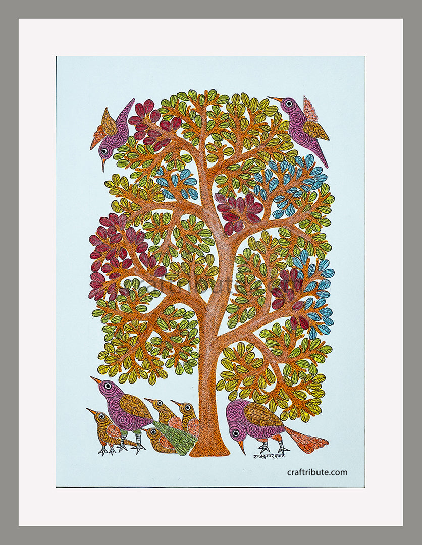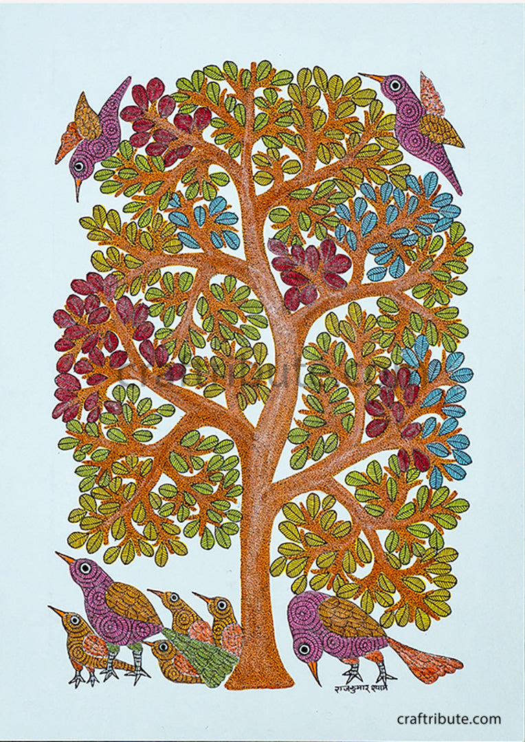 Today’s Gond paintings are contemporary expressions of the tribal wall paintings practiced by the Gond tribe in Madhya Pradesh and bordering areas of Maharashtra, Andhra Pradesh.This tribal Art is world famous for the beautiful forms of trees, animals and birds. Because of the vibrant colours and intricate textures which derive its inspiration from traditional tattooing designs (Gondana). Gond Paintings are eye catchy and loved by art connoisseurs across the world!! Tribal way of life is deeply rooted in nature and it’s no surprise that the trees and the wildlife around are still the chief source of inspiration for the tribal artists.