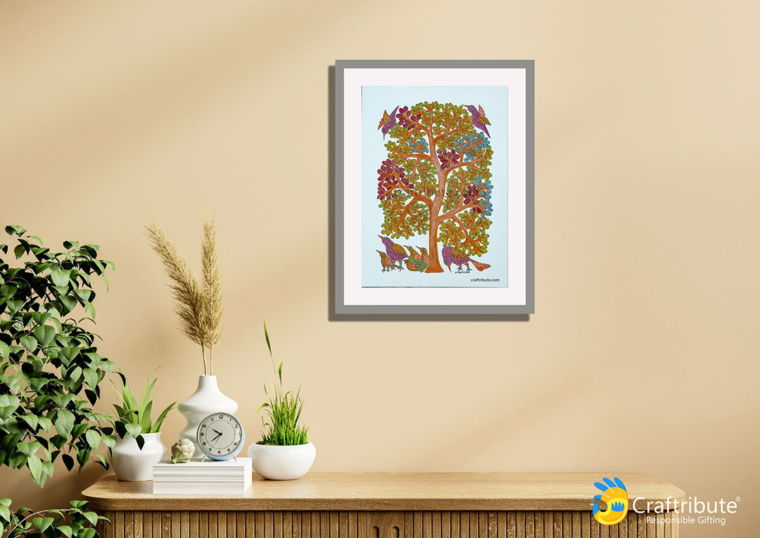 Authentic Tribal Gond Painting | Craftribute | Birds under a Tree | Wall Decor - 27 cm x 37.5 cm