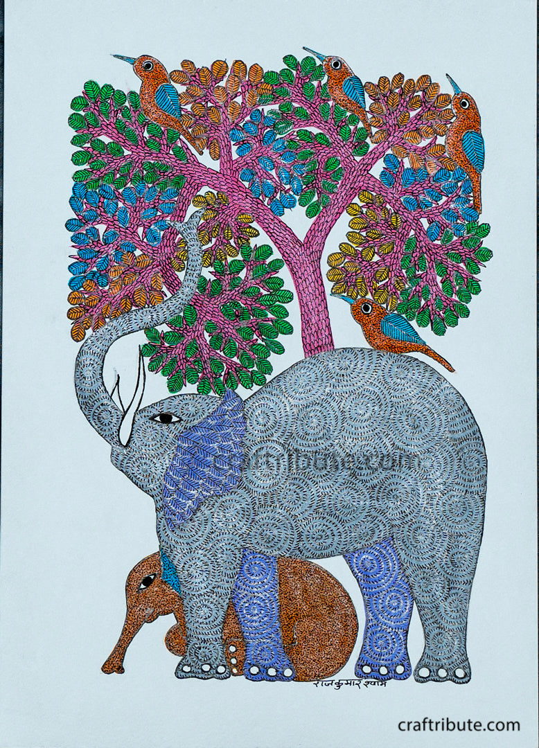 Today’s Gond paintings are contemporary expressions of the tribal wall paintings practiced by the Gond tribe in Madhya Pradesh and bordering areas of Maharashtra, Andhra Pradesh.This tribal Art is world famous for the beautiful forms of trees, animals and birds. Because of the vibrant colours and intricate textures which derive its inspiration from traditional tattooing designs (Gondana). Gond Paintings are eye catchy and loved by art connoisseurs across the world!! Tribal way of life is deeply rooted in nature and it’s no surprise that the trees and the wildlife around are still the chief source of inspiration for the tribal artists.