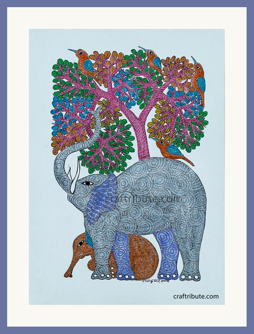 Authentic Tribal Gond Painting | Craftribute | Elephants under a Tree | Wall Decor - 21 cm x 29.5 cm