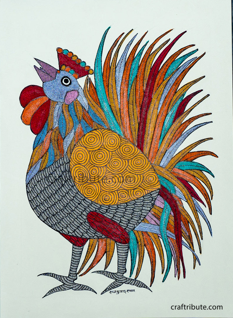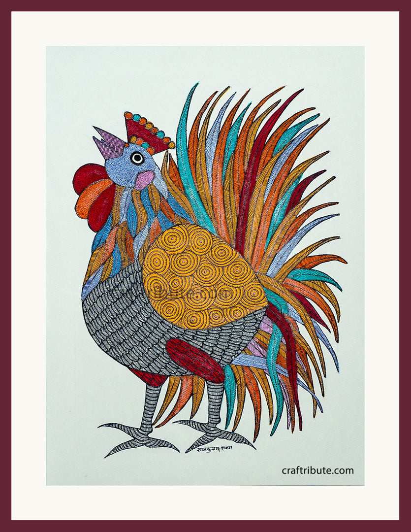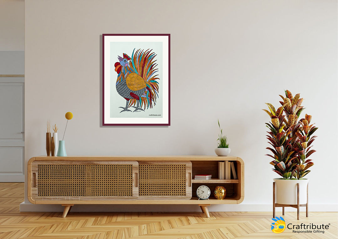 Authentic Tribal Gond Painting | Craftribute | Rooster | Wall Decor - 28 cm x 37.5 cm