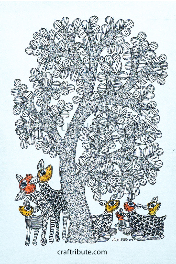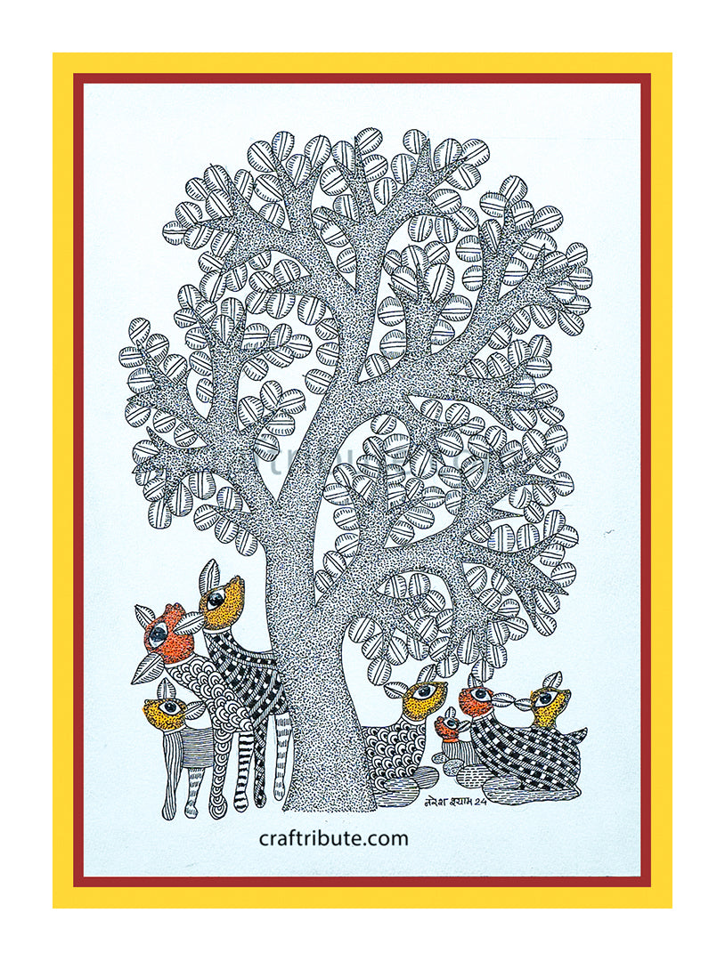 Today’s Gond paintings are contemporary expressions of the tribal wall paintings practiced by the Gond tribe in Madhya Pradesh and bordering areas of Maharashtra, Andhra Pradesh.This tribal Art is world famous for the beautiful forms of trees, animals and birds. Because of the vibrant colours and intricate textures which derive its inspiration from traditional tattooing designs (Gondana). Gond Paintings are eye catchy and loved by art connoisseurs across the world!! Tribal way of life is deeply rooted in nature and it’s no surprise that the trees and the wildlife around are still the chief source of inspiration for the tribal artists.