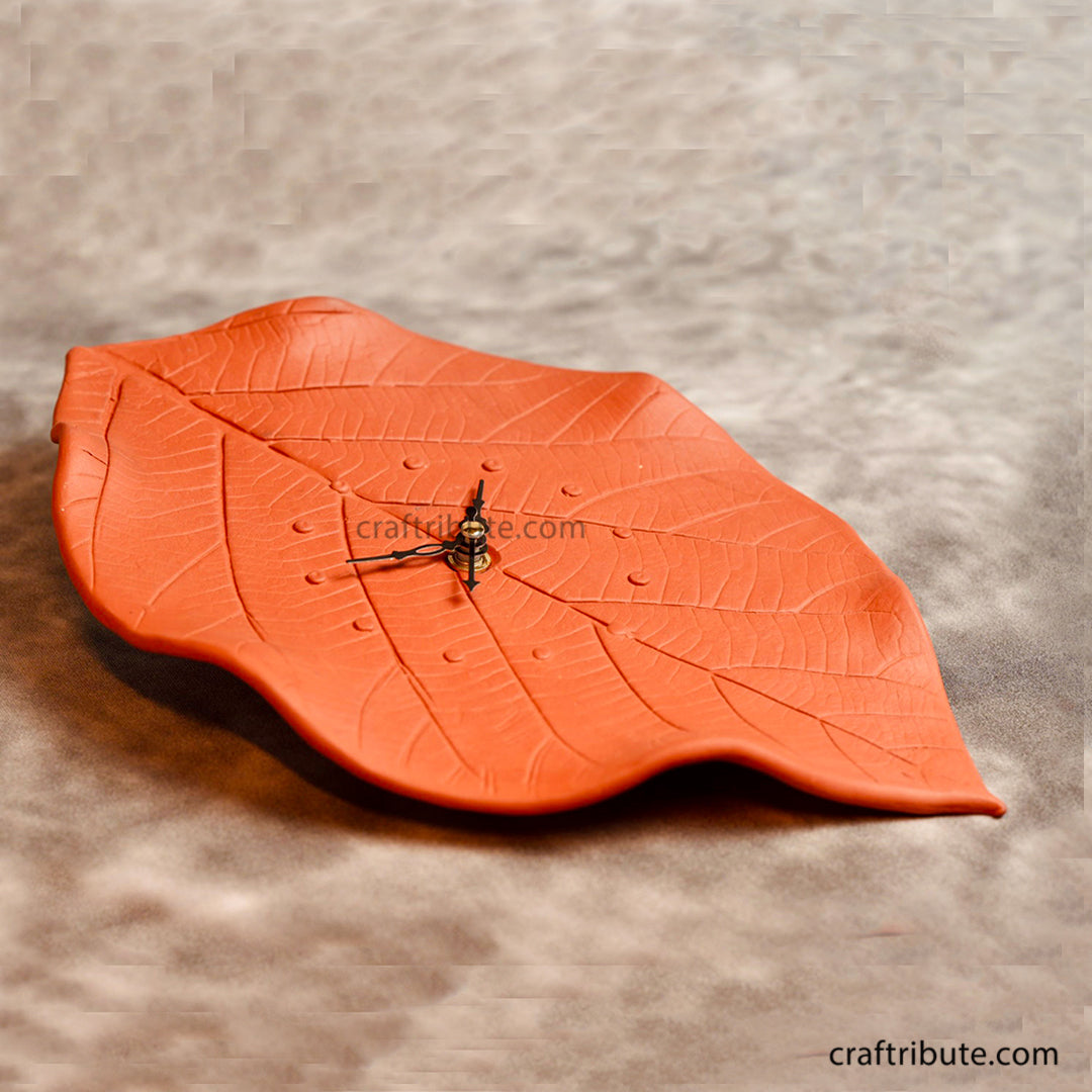 Craftribute | Terracotta Wall Clock | Teak Leaf | 29.5 cm x 19 cm