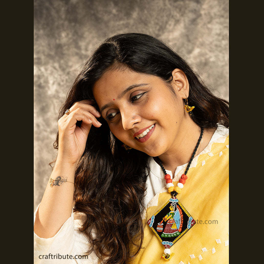 This beautiful handcrafted jewellery set comprises of a hand painted pendant sourced responsibly from the grass root artisans practicing Tikuli Art in and around Patna and a set of matching earrings. Yellow, White  & Red thread beads in black thread makes this piece stand out easily on any colour garment.