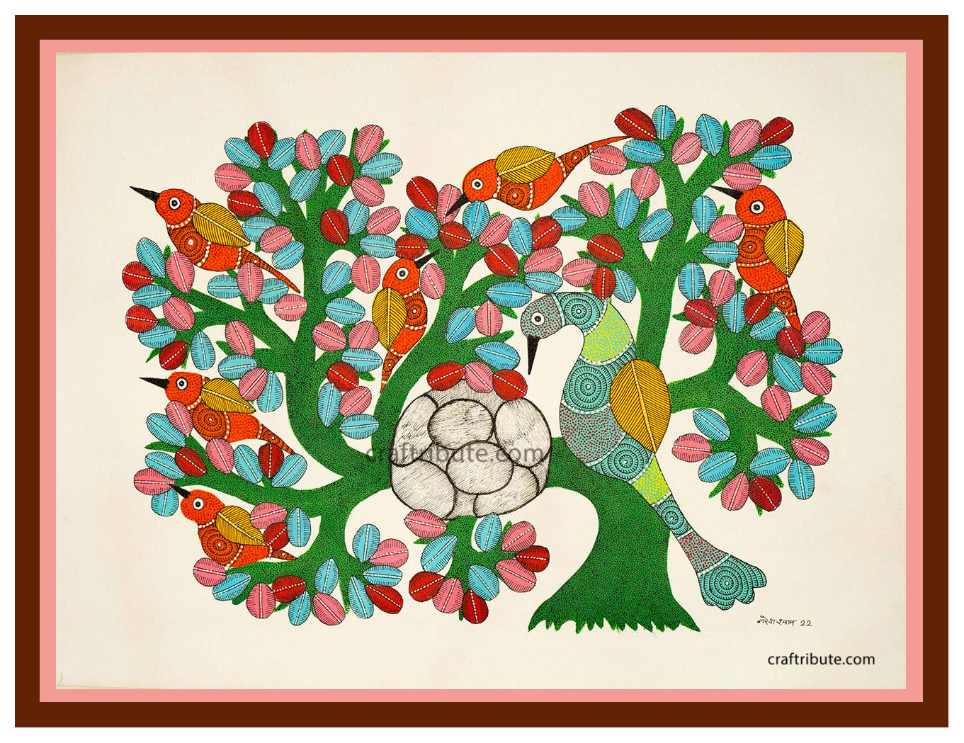 Today’s Gond paintings are contemporary expressions of the tribal wall paintings practiced by the Gond tribe in Madhya Pradesh and bordering areas of Maharashtra, Andhra Pradesh.This tribal Art is world famous for the beautiful forms of trees, animals and birds. Because of the vibrant colours and intricate textures which derive its inspiration from traditional tattooing designs (Gondana). Gond Paintings are eye catchy and loved by art connoisseurs across the world!! Tribal way of life is deeply rooted in nature and it’s no surprise that the trees and the wildlife around are still the chief source of inspiration for the tribal artists.
